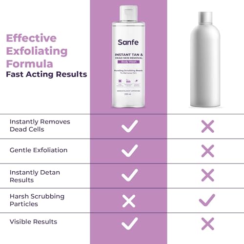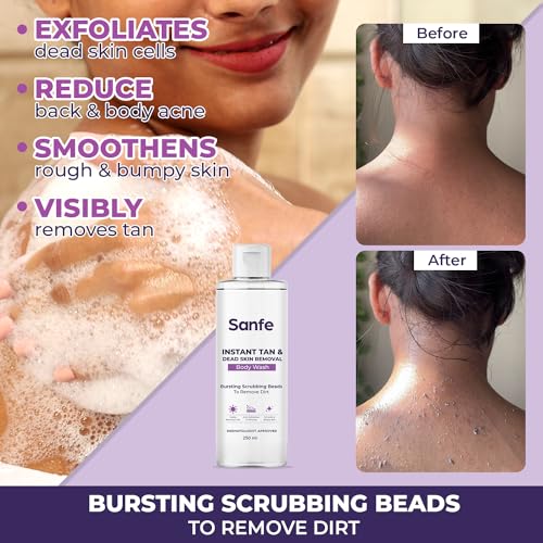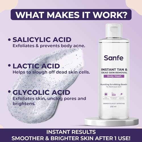 Sanfe Instant Tan & Dead Skin Removal Exfoliating Body Wash | Visibly Removes Tan | AHA Exfoliation in Minutes | Smooth & Bright Skin | 250ml