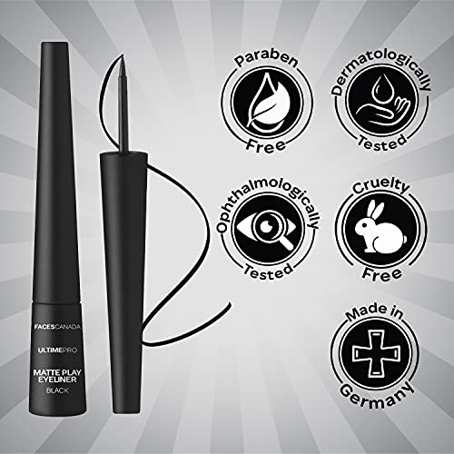 Faces ultime pro matte eyeliner has excellent colour pay off and high coverage. Matte finish brings depth to eye looks contrasting with the skin's texture for an effect that looks strikingly modern. It delivers the deepest pigment line and is easy to apply. For eyes that turn heads this is a much required quick drying liquid to matte liner that delivers full colour for up to 17 hours and more. The eyeliner is waterproof and sweat proof. It is dermatologically and opthalmologically tested. Black is the colour that is must have in your range. To get your bold confident and sharp look every day add the black matte eyeliner.