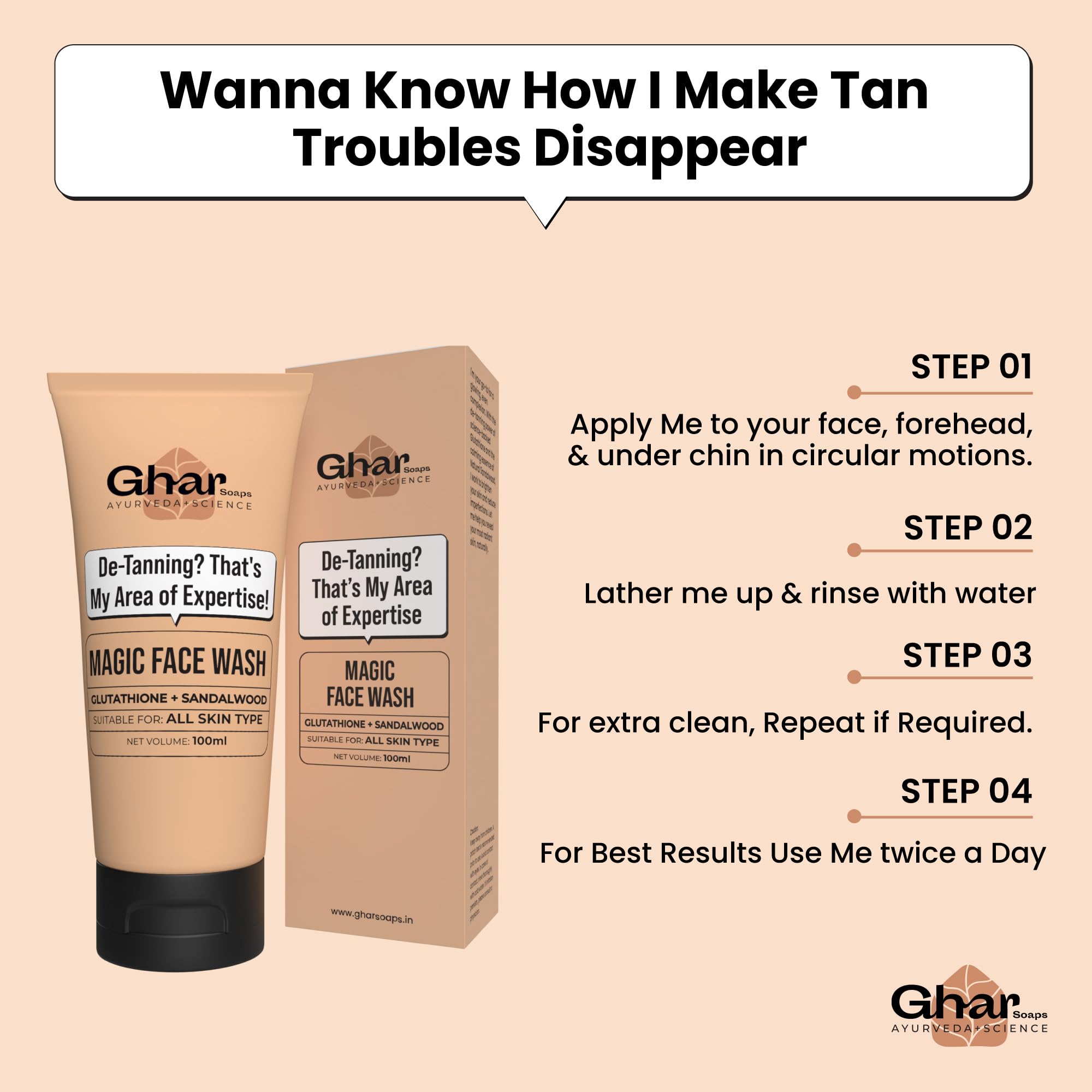 Watch those tan lines vanish in with me every day! I'm your De-tan Magician, offering stress-free relief with a delightful fragrance. With saffron, sandalwood, and coconut oil by my side, I'll make your skin radiant, bright, and moisturized.