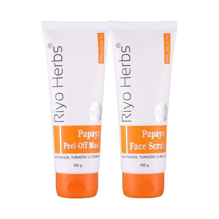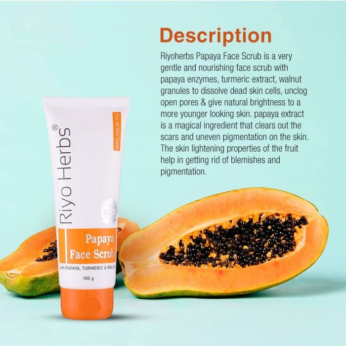 Riyoherbs papaya peel off mask is packed with vitamin C & E which rejuvenates skin. The papaya peel off contains. Enzymes that help remove dead skin cells whiteheads blackheads from the surface of skin. Papaya peel off mask benefits in treating pigmentation blemishes & age spots. Natural extracts like papaya cucumber turmeric orange peel makes it suitable for all skin types. Regular use makes skin glowing soft and supple. Riyoherbs Papaya Face Scrub is a very gentle and nourishing face scrub with papaya enzymes turmeric extract walnut granules to dissolve dead skin cells unclog open pores & give natural brightness to a more younger looking skin. papaya extract is a magical ingredient that clears out the scars and uneven pigmentation on the skin. The skin lightening properties of the fruit help in getting rid of blemishes and pigmentation.