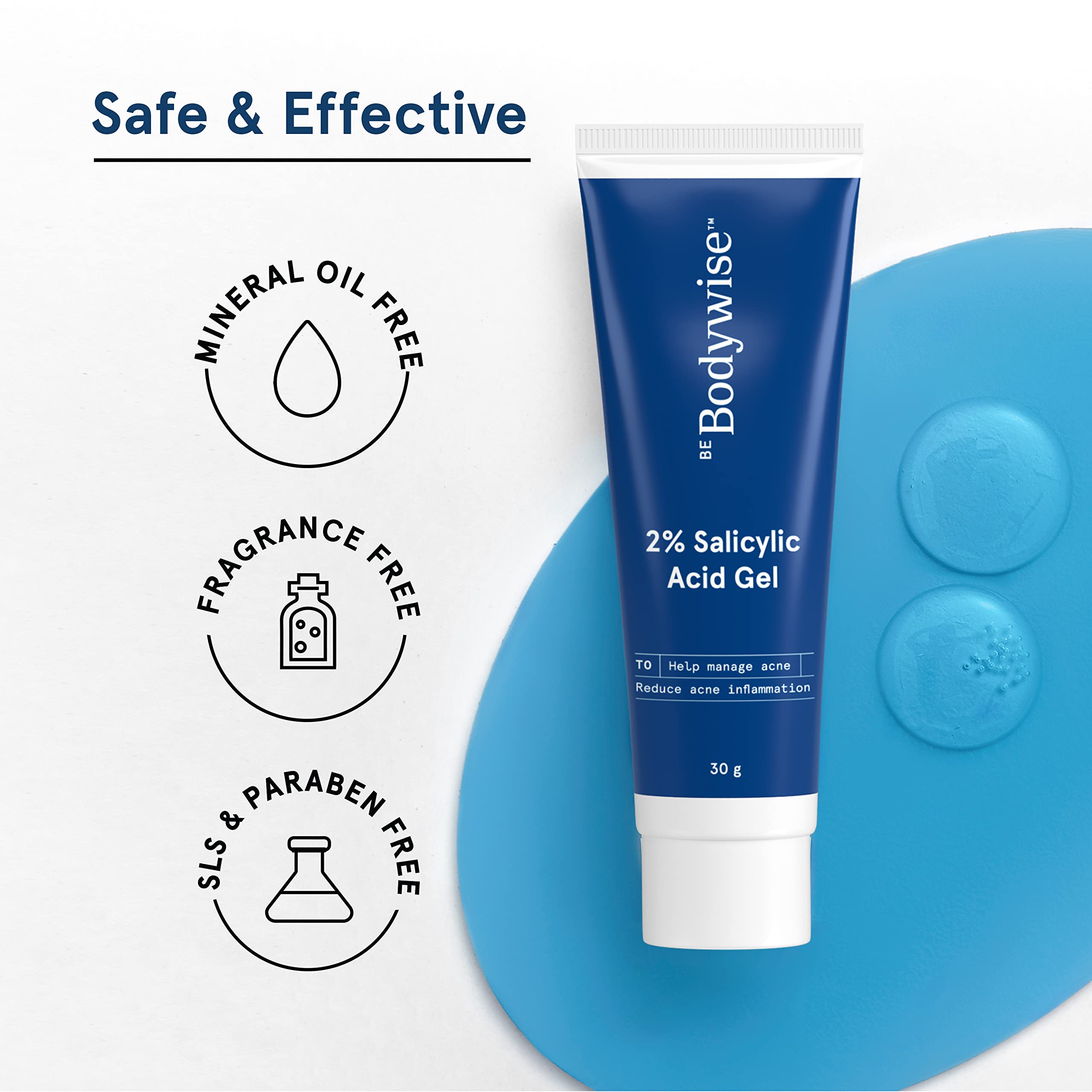 Be Bodywise 2% salicylic acid gel | Reduces Acne Breakouts & Spots | 2% Salicylic Acid 1% Glycolic Acid and 4% Niacinamide | Fragrance Free | 30 grams