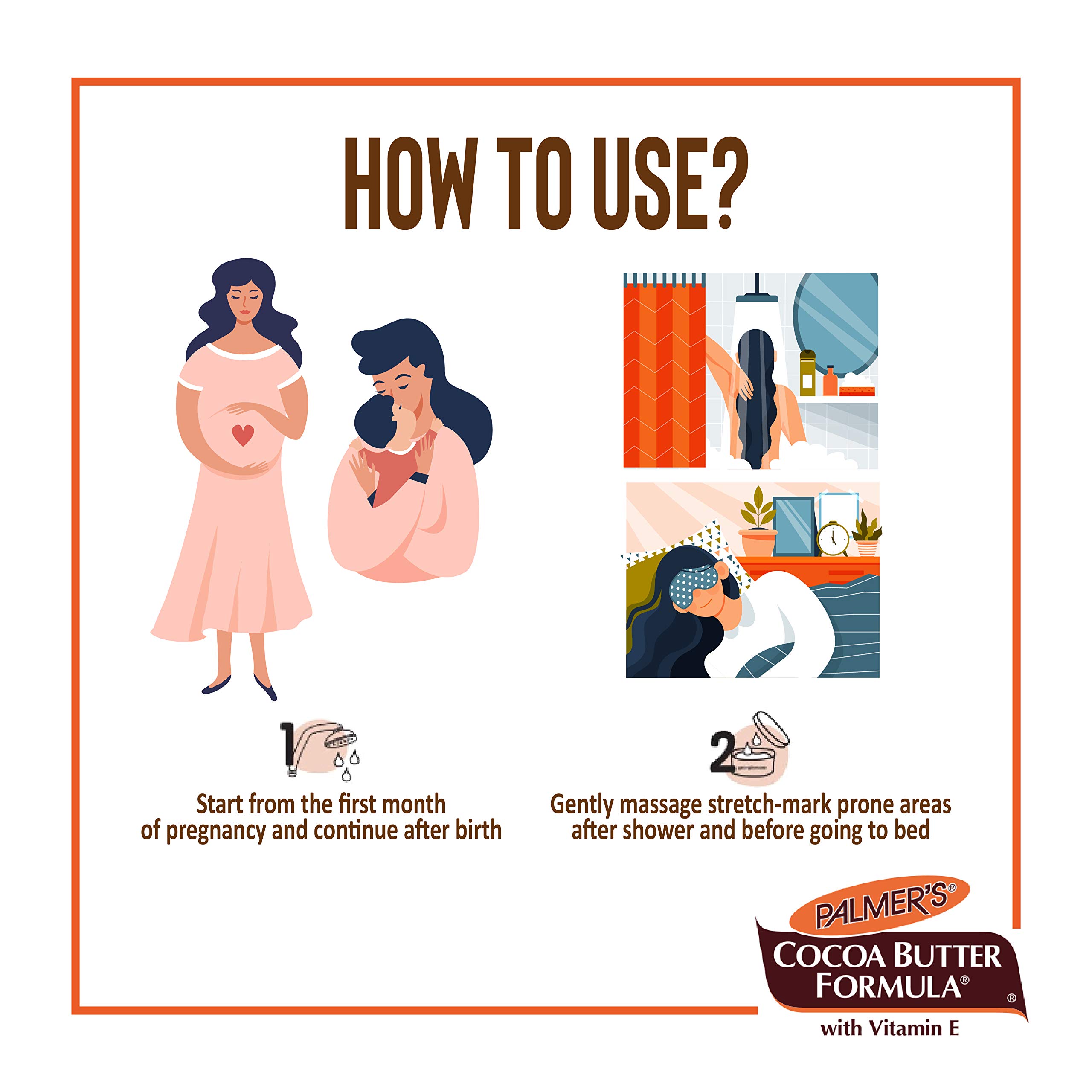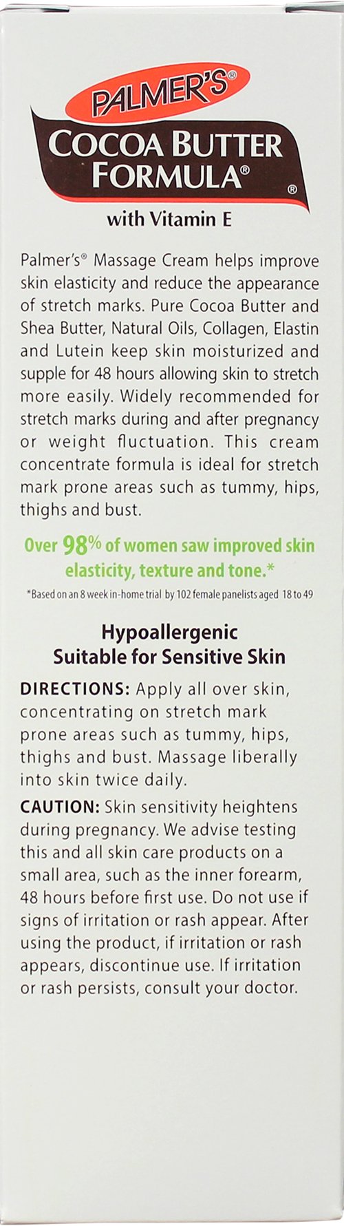 Nine out of ten pregnant women develop stretch marks at some point in their pregnancy. And aside from the belly thighs hips breasts and buttocks can all show signs of stretching. The cause? The collagen and elastin fibers that keep your skin firm and tight stretch and tear due to the pregnancy hormones and the pressure on your body from the rapid weight gain. While you cant prevent stretch marks you can help reduce their appearance with the support from Palmer's. Whatever product you choose - whether it's a stretch mark cream a stretch mark oil or a stretch mark lotion natural cocoa butter is safe to use on your body while pregnant and helps reduce stretch marks as you and your baby grow. Palmer's Massage Cream helps visibly improve skin elasticity and reduce the appearance of stretch marks. Pure Cocoa Butter Shea Butter Natural Oils Collagen Elastin and Lutein keep skin moisturized and supple for 48 hours allowing skin to stretch more easily. A pregnancy must have this everyday body cream is widely recommended for stretch marks during and after pregnancy. This non-greasy cream is ideal for all over body use in place of your regular skin moisturizer.