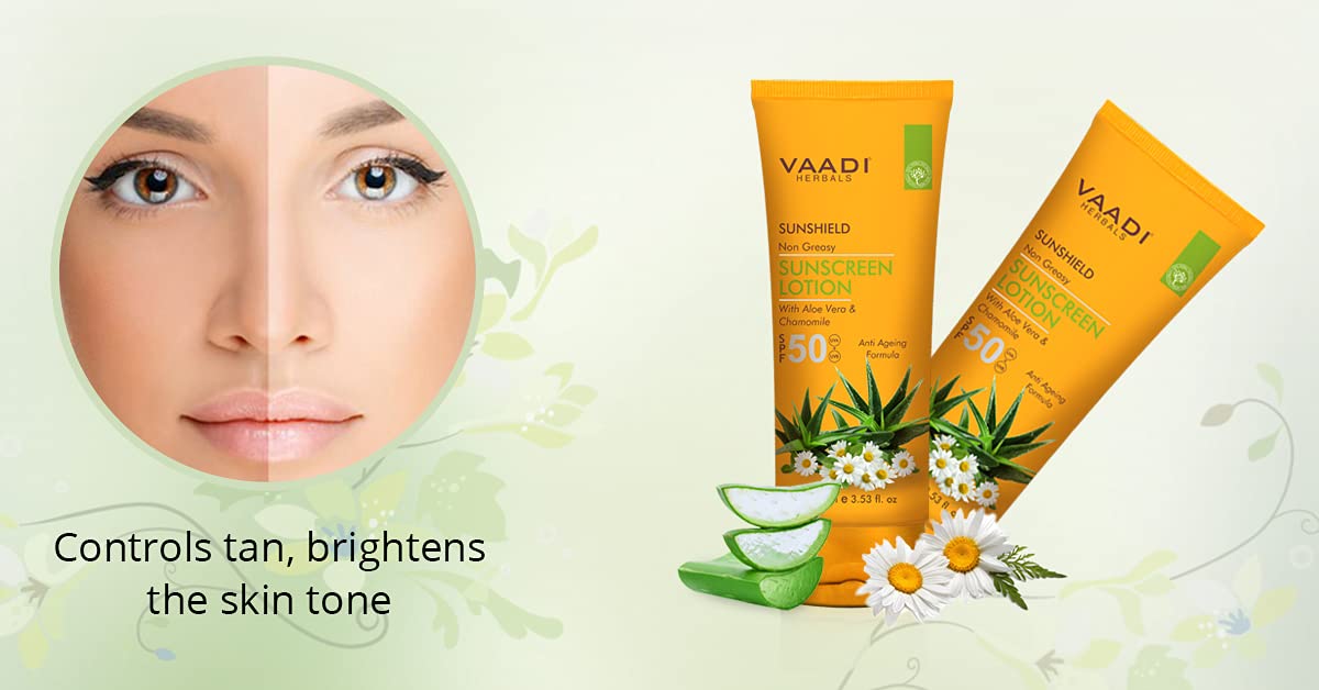 Why does the skin need protection from the sun? The skin acts as a perfect shield from environmental changes and diseases. To carry on its functions effectively the skin too needs nourishment and strength. The body gets the essential vitamin d from the sun. But what one over-rules here is the fact that the same sun also sends the harmful UVA and UVB rays to the earth which are damaging the skin. If not kept under tab it can also lead to permanent darkness excessive pigmentation and in worst cases skin cancer. Why is this lotion in SPF 50 important for skin protection? This lotion is packed with nutrients and comes in an easy to carry tube shaped bottle that promises to keep your sun related worries at bay. It comprises of gentle aloe vera extract which is a natural sunscreen and protects and soothes damaged skin. Chamomile extract is also known to gently calm sun burns and heal over exposed skin. This lotion in SPF 50 should be liberally and evenly applied on face and exposed parts of body (arms neck legs etc). It should be re-applied if in the sun over 2 hours. Why is aloe vera called the skin expert? Aloe vera is the perfect remedy for any problems associated with the skin. Be it sun burn irritation allergies or be it the natural weather conditions going against the skin. Aloe vera gel which is taken from the leaf of aloe plan is rich in all vital vitamins that make up for a perfect shield against adverse conditions. With the goodness of vitamin a f c and b-12 aloe vera brings back the flawless suppleness to the skin. By aiding pore opening aloe vera helps in the percolation of important nutrients to the layers of skin thereby healing from within. The skin is restores nourished and at its attractive best ever.