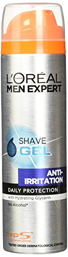Loreal Paris men expert anti irritation glycerine shave gel 200ml for uncomfortable dry and tight feeling skin. Daily shaving is a test for your skin. Protect it against the effects of shaving with men expert skin caring anti irritation shave gel. It helps to improve razor glide for an easier smoother shave and creates a protective barrier to help reduce friction razor burn and irritation. Skin protect system action 1 improves glide for an easier smoother shave. Action 2 creates a protective barrier which reduces friction. Helps protect the skin against the drying effects of shaving which can leave it feeling irritated. High performance formula enriched with hydrating glycerine. Ultra comfortable shave. Even after rinsing skin does not feel tight.
