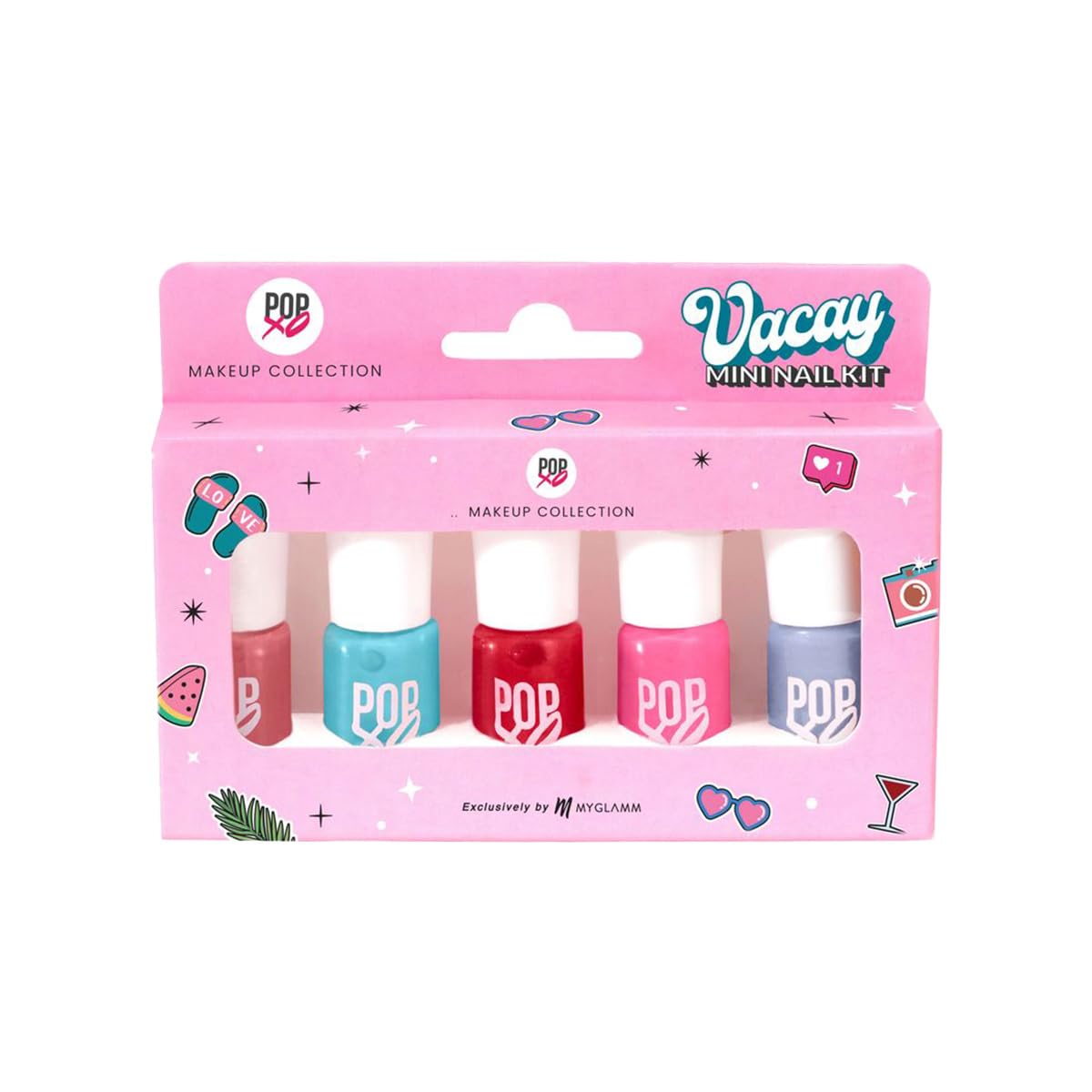 MyGlamm POPxo Makeup Collection -Mini Nail Kit-Dreamin'-5X3ml Pastels Glossy FinishDaydreamin' in pastels. Daydreamin' is a stunning set of 5 chip-resistant pastel mini nail polishes that is all you need to stay winning at your manicure game. These pastel beauties are totally worth #Simping for. Always having a set of freshly painted nails is every girl's ideal state of living. While frequent salon visits can be heavy on the pocket there is one fun trick that won't break the bank. Bring the priceless feeling of new nails home with POPxo Makeup Collection's Daydreamin' Mini Nail Kit. This mini nail polish set includes 5 nail paints in trendy pastel colours that are perfect for acing the soft girl vibe. These mini nail polishes have a chip resistant formula and offer a long-lasting wear. They have a high gloss finish and make your digits look oh-so-fab. So are you ready to be your own nail technician?MyGlamm POPxo Makeup - Mini Nail Kit - Vacay - 15ml (Set of 5) | Glossy Nail Polish Set | Long Lasting & High Gloss Effect | Chip Resistant Nail Paints | Cruelty-free & VeganVacay Mood: 24*7 This stunning kit of 5 chip-resistant nail polishes comes in bright poppin' colours to give you major beachy vibes. Escape the ordinary and let your mani dish out #VacayGoals! A set of freshly painted nails is every girl's happy place. While frequent salon visits can be heavy on the pocket there is one fun trick that won't break the bank. Bring the priceless feeling of new nails home with POPxo Makeup Collection's Vacay Mini Nail Polish Set. It includes 5 nail paints in bright shades of pink peach blue red & turquoise perfect for that vacay mood. All nail colours in this mini nail polish kit are made with a chip-resistant formula and offer long-lasting wear. Its high gloss effect gives your at-home manicure a salon-like shine. Are you ready to flaunt those gorgeous nails?