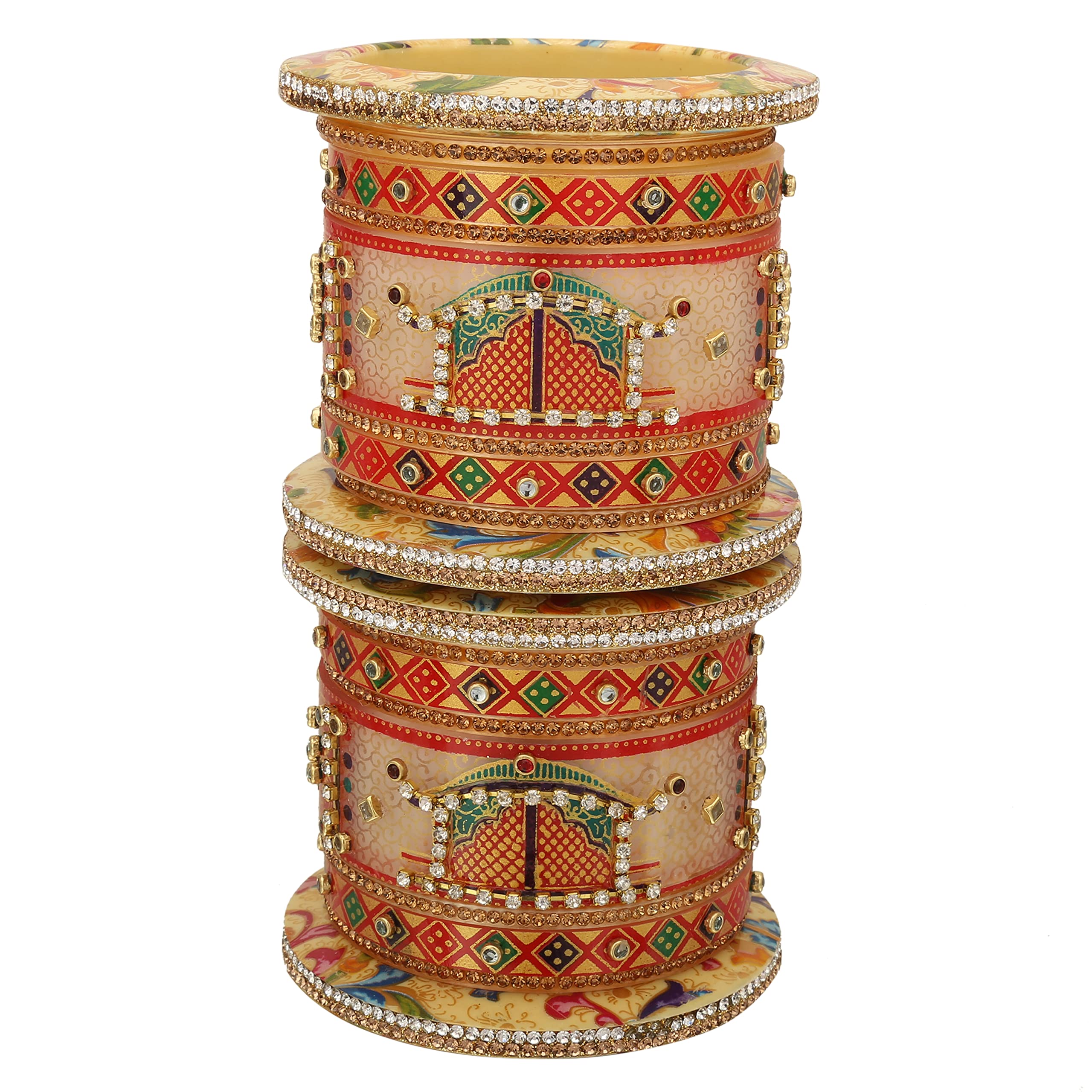 LAC BANGLES presents you an eye-catching wonderful latest design bangles by the artisans of Rajasthan India. This bangle set has 9 bangles in one hand a total of 18 seep / plastic bangles which comprises 4 designer bangadi bangles stud with white & golden color stones 8 bangles with golden stones 4 kada with diamond shape design 2 dulhan palki design big kadas. This unique Indian handicraft is an all-occasion gift to add grace to any outfit. Pair it with any traditional ethnic designer casual or any party wear & create your own style statement.