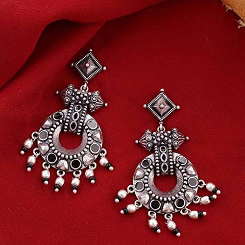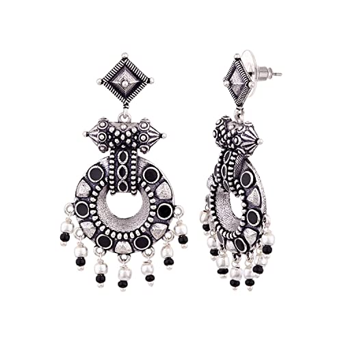Women's Oxidised Brass Lightly Embellished Black Drop Boho Style Earrings(Free Size)(Silver)