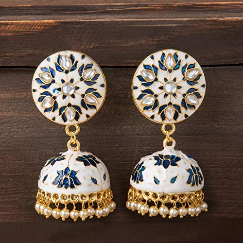 Ethnic Golden ColorIndian Traditional Handmade Meenakari Jhumka Earrings. Blue Color Floral Designed Kundan Studded Simple and Eye Catched with hanging Pearls. Our Product is perfect for valentines Anniversary day gift for girlfriend and Wife.