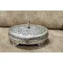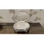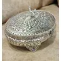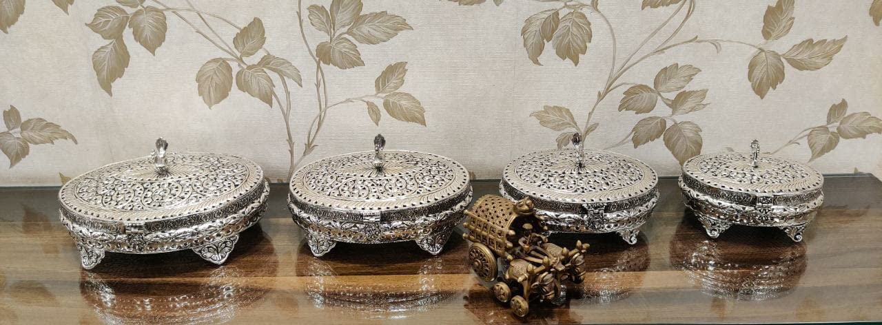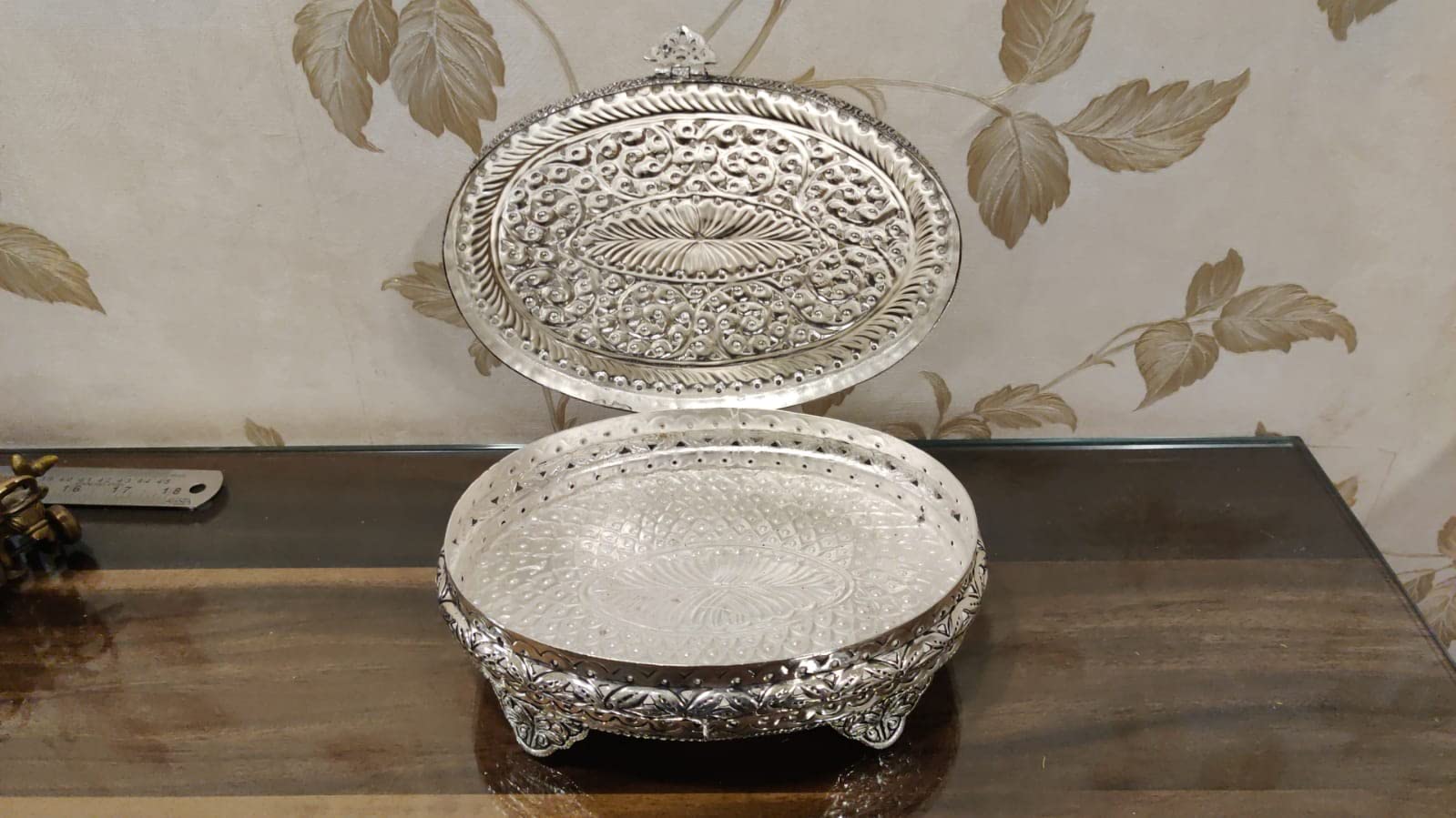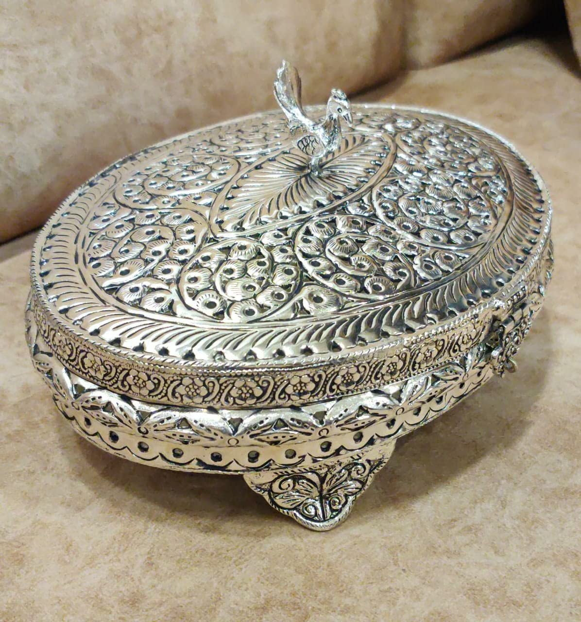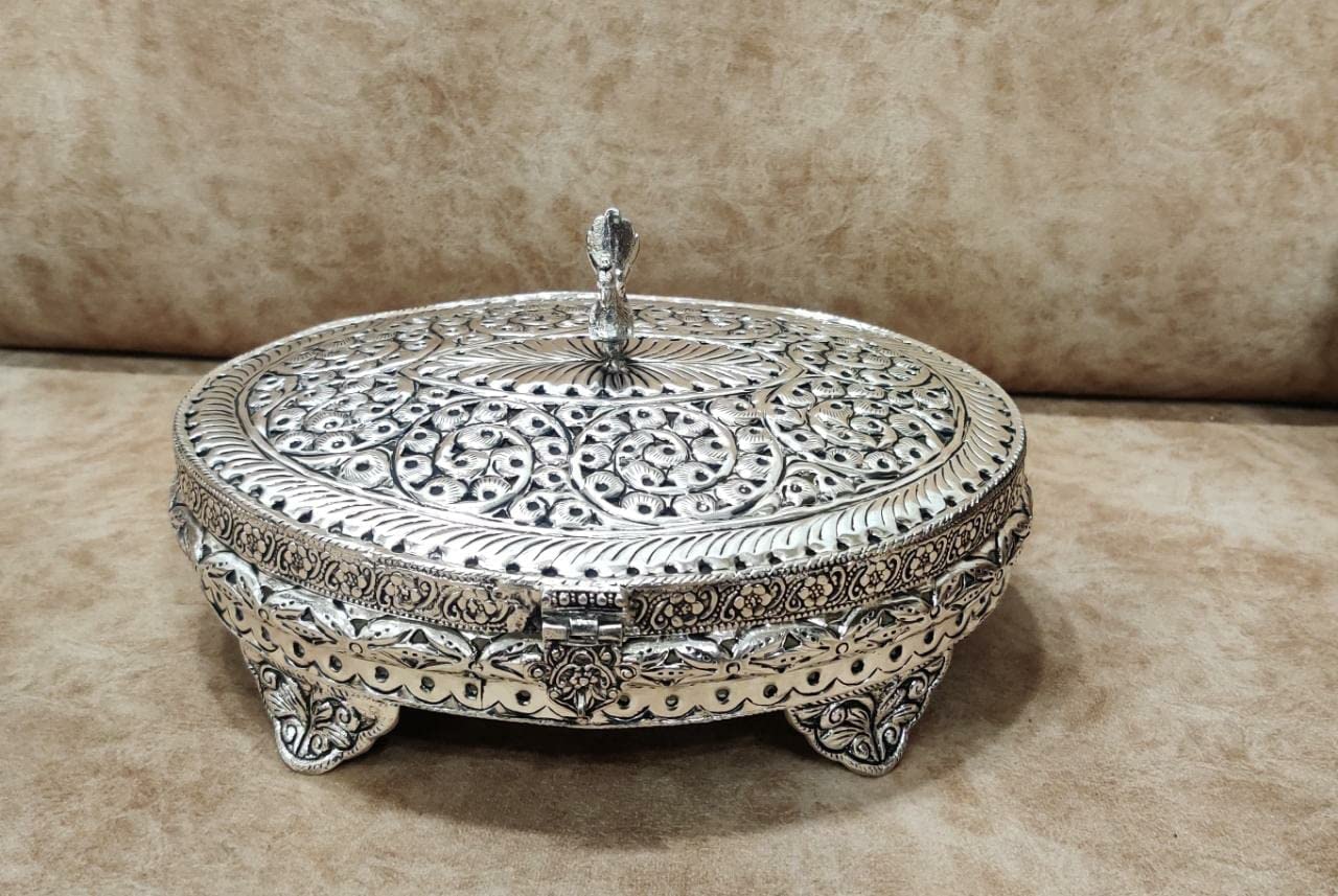 This elegant JEWELLERY CUM DRY FRUIT box made of German Silver and brass cover enhanced with german silver embossing work is a result of meticulous craftsmanship.This unique blend of material craft and art work has lent an appeal that will resonate brilliantly with the festive mood of your near and dear ones on special occasions like diwali. Gift precious articles in our exclusive German silver hand engraved boxes.so your memories are captured in something very exclusive!!