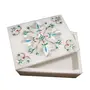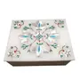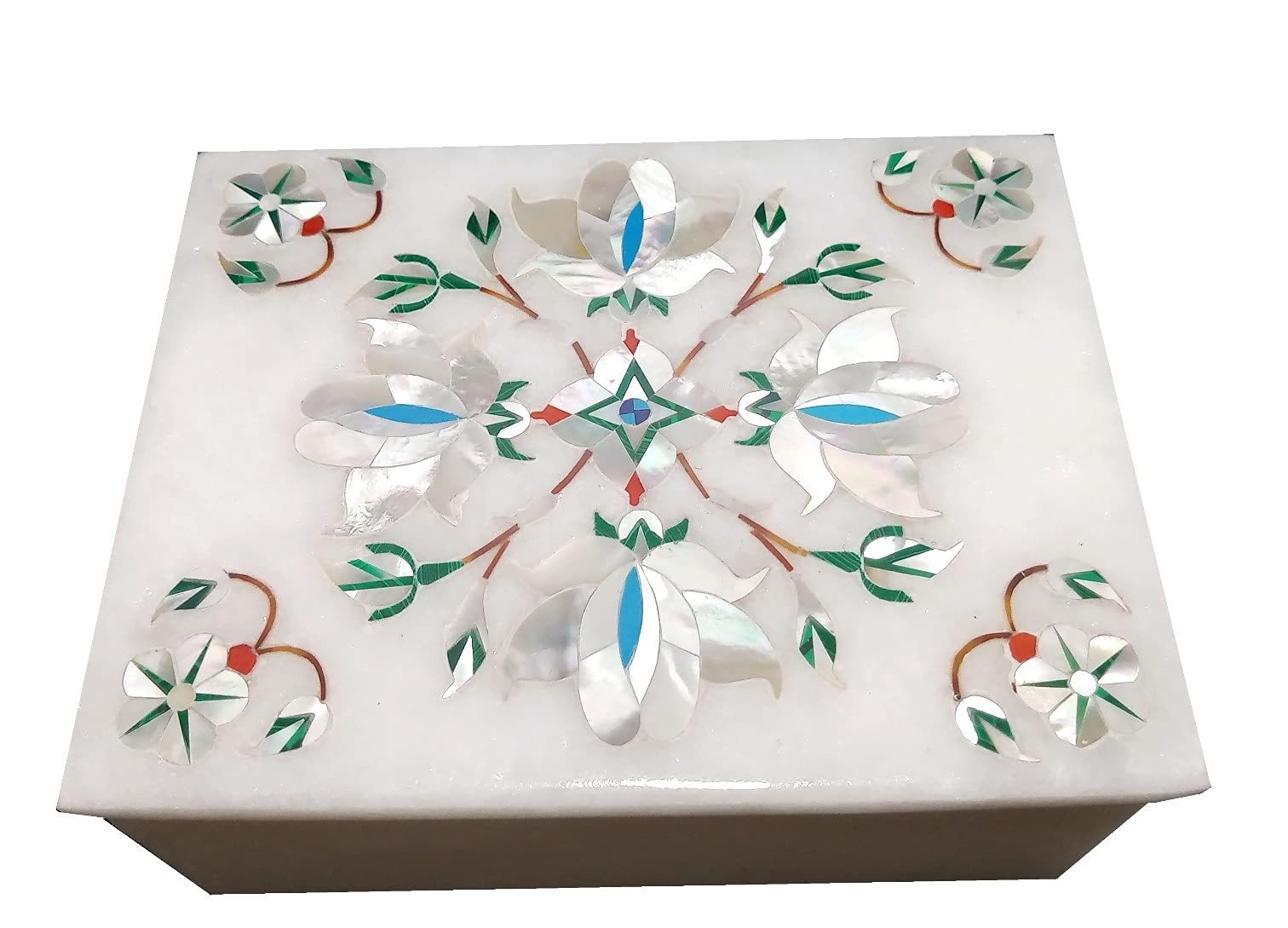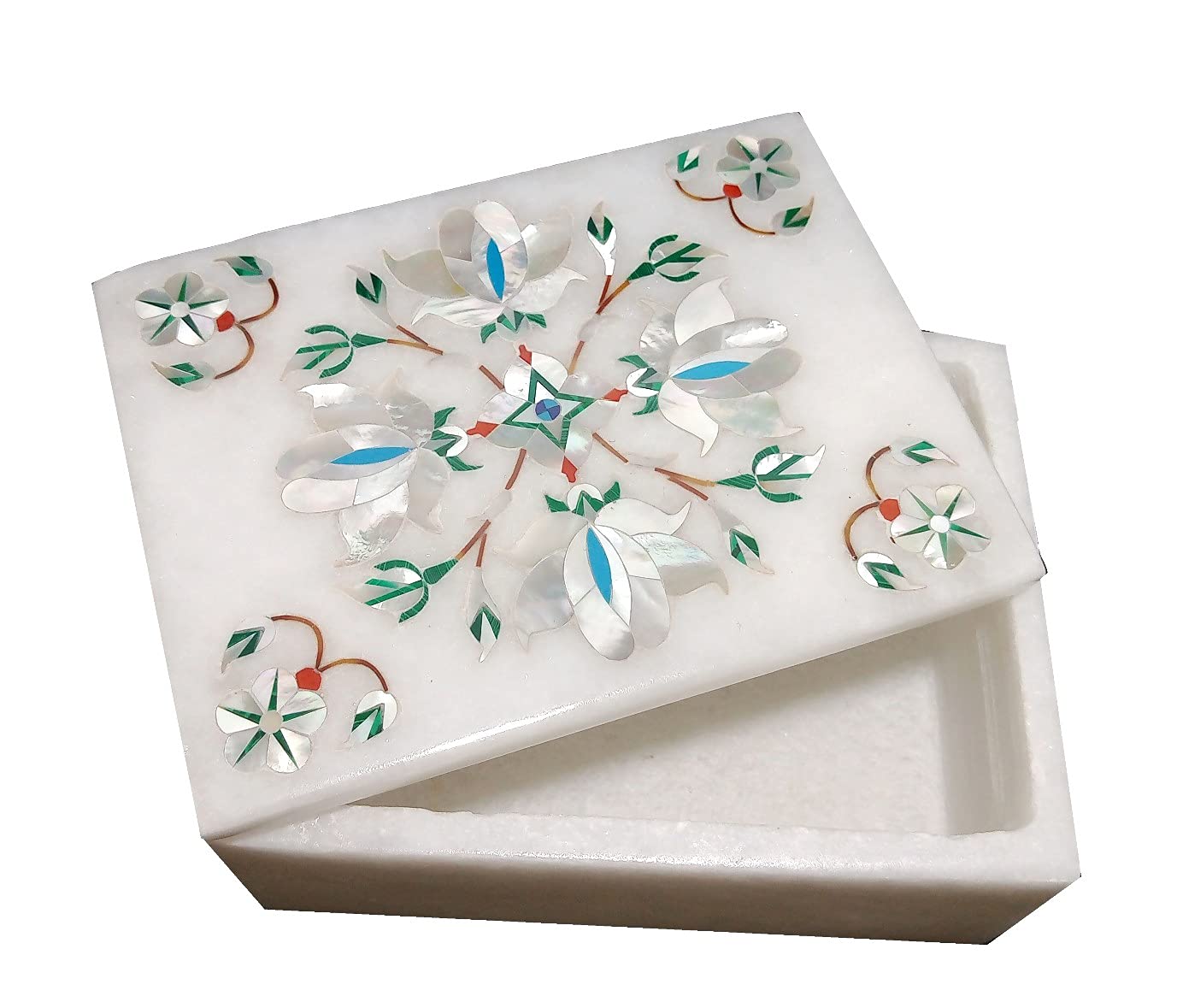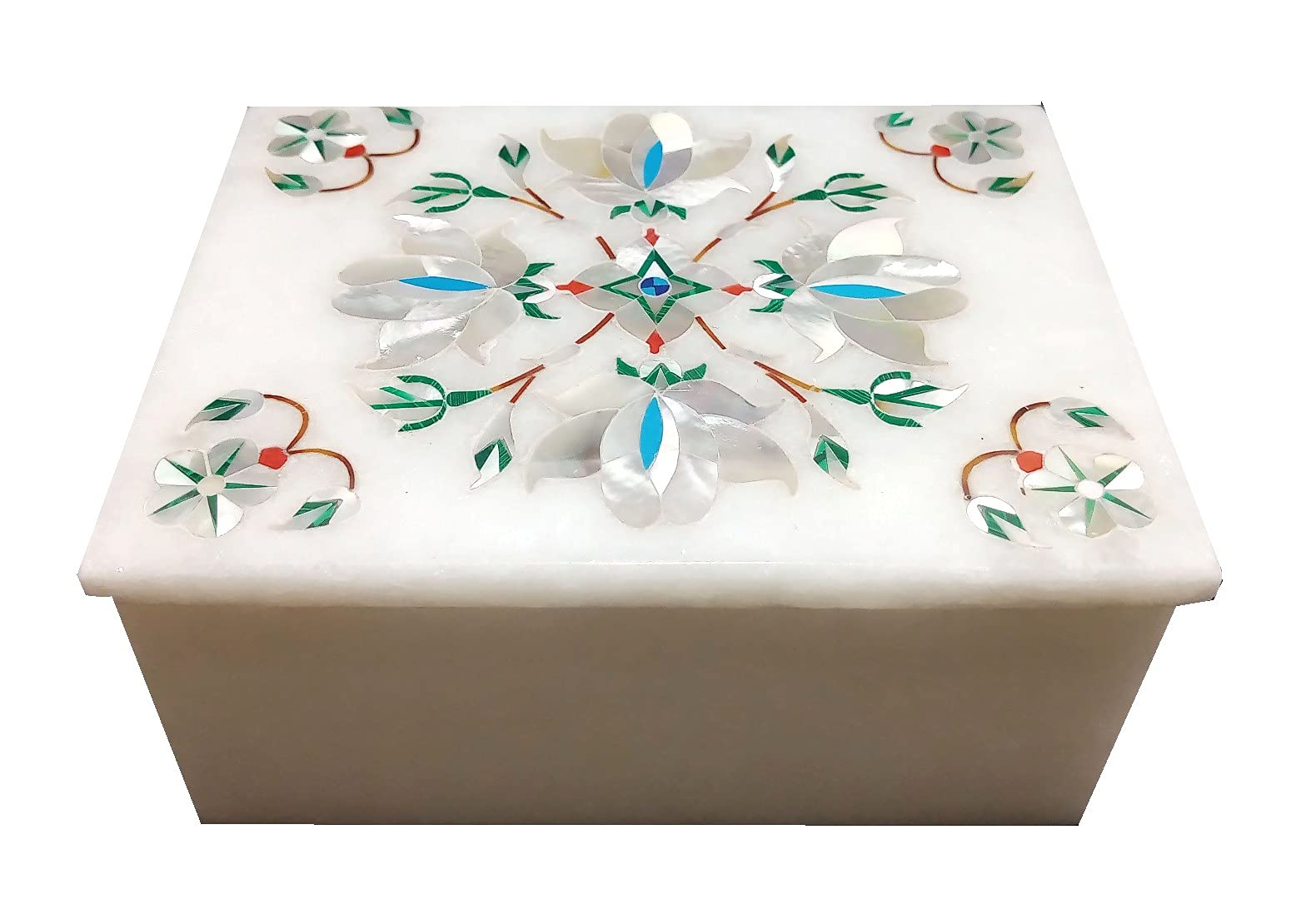 MARBLE INLAY ART AGRA - PACCHIKARI Handcrafted Rectangular White Marble Box is made from Single piece of marble and produce by the descendants family who build the Taj Mahal. It is a Special Art of Agra India. MARBLE INLAY ART AGRA - PACCHIKARI Handcrafted Rectangular White Marble Ornament Box is made from Single piece of marble. The Rectangular White Marble Jewelry Box is made in Agra India & fully handmade. Stones are Used in the Box : Orange - Carnelian. Green - Malachite. Brown - Jasper. White : Mother of Pearl.Light Blue - Turquoise. To maintain this art piece simply clean it with soap water and dry cotton cloth. It is an art piece which will be a beauty & the conversation piece at home. We will send you a Paper with name of the stone meaning of the Semi Precious Stones.