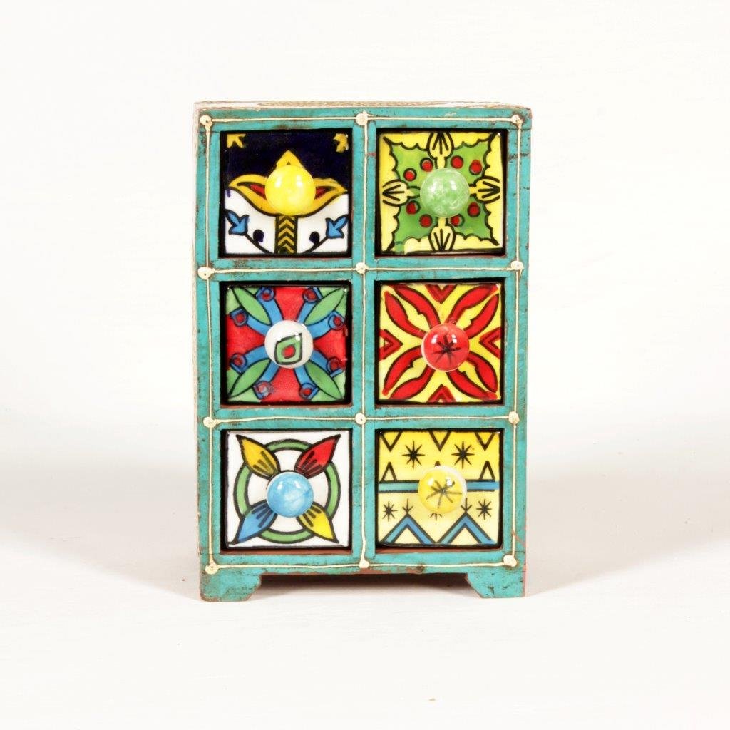 Rajasthani hand painted decorative 6 drawer wooden chest with ceramic drawers made in india by artisans using traditional ways designer touch with modern look elegent handmade product if this is looking old and used please do not place order.