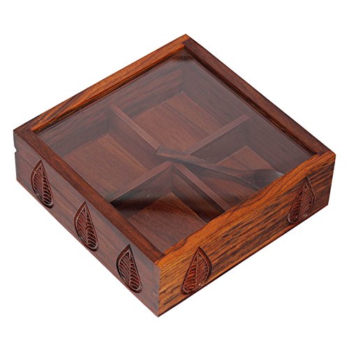 Wooden spice box 8 inch Cooking can be considered as an art and the kitchen as a canvas. Just like in painting you will need the right spices and ingredients at the right place for creating a masterpiece food. It would be very convenient if all the spices are placed close to each other so that they can be accessed easily while cooking. The wooden spice box helps you to store up to four different spices close to each other without mixing them up. The main advantage of using the wooden spice box is that the wooden material preserves the purity of the spices and keeps them in a natural environment and improves the taste of the dishes. The box can be also used for serving the nuts and dry fruits to your friends and family.