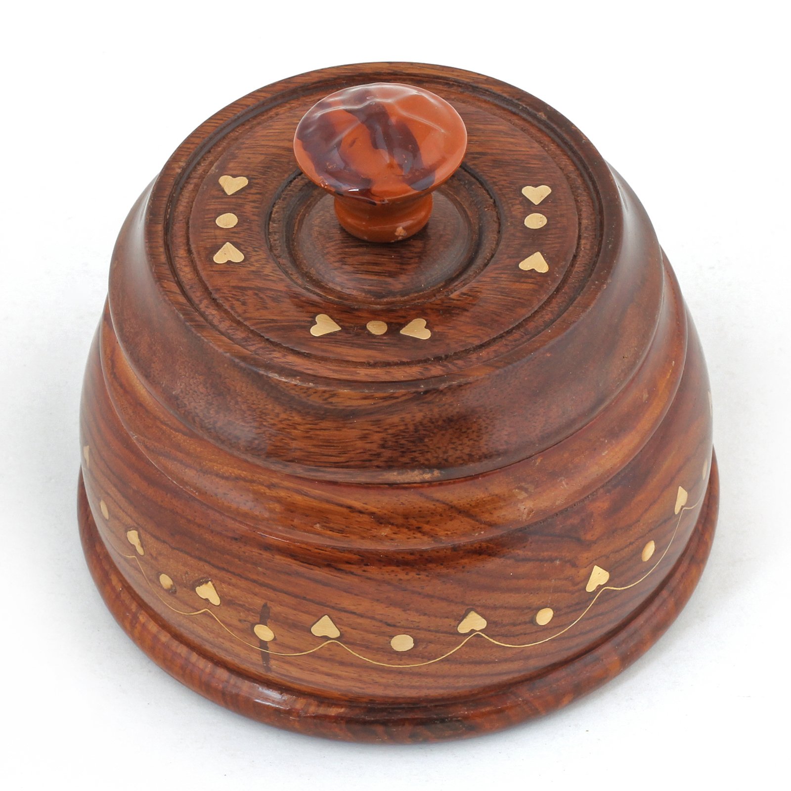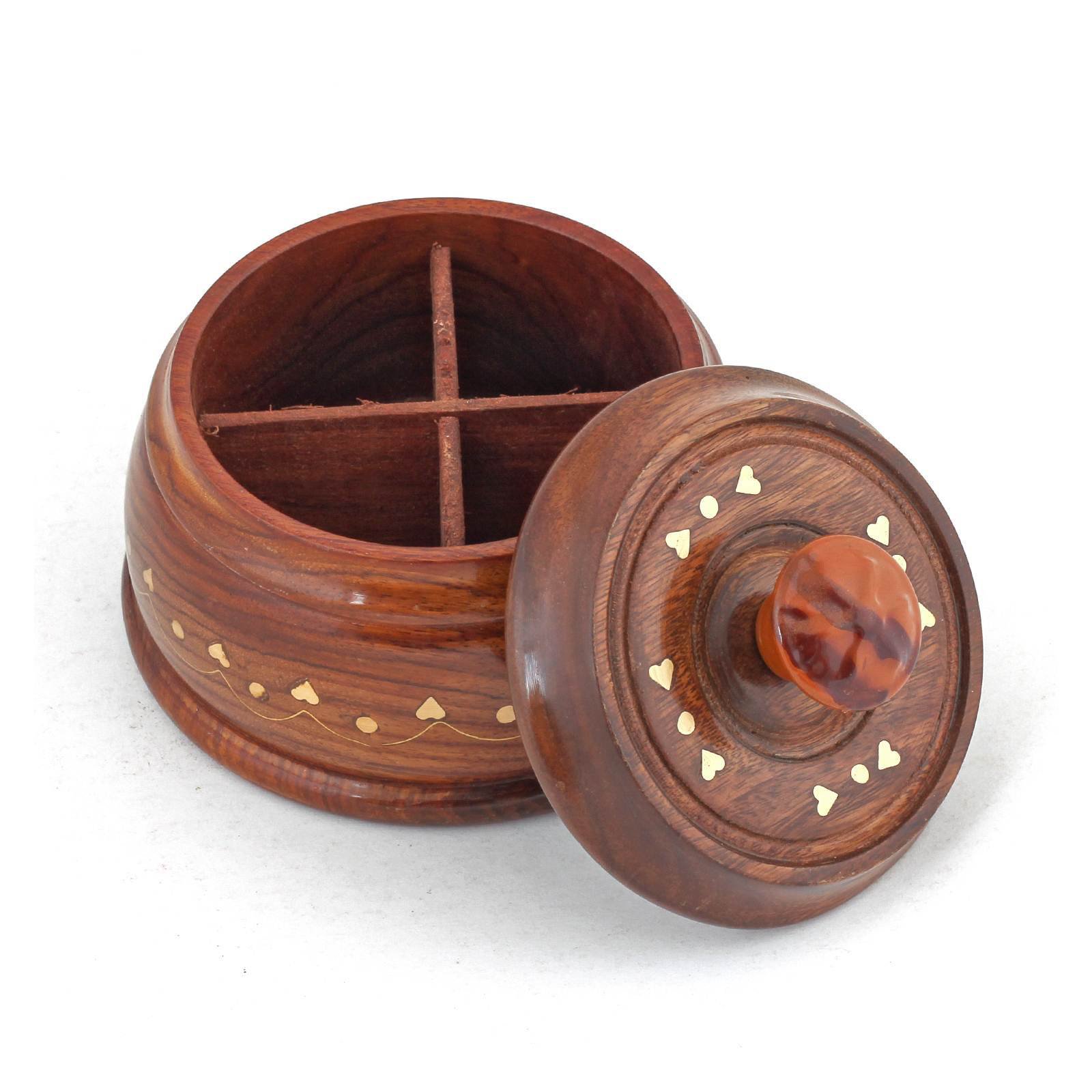 Wooden Dry Fruit Box Round with Brass Inlay Work on Top About The BrandVARANASI WOODEN TOYS Home & Lifestyle is establish in the year 2016. We are Manufacturer. Supplier Exporter of Wooden Handicrafts etc. We have perfect Indian handcrafts. We have skilled team of craftsmen. A design and development cell to execute our productions quality standards and their timely delivery. We provide full assistance in understanding our clients requirements with packing promotions logistics with very economic mode. Our Product are shipped all over the world. Our primary products are Wooden Items like Nesting Dolls Wooden card Holder Wooden Tray Home Decor Items and games like Tic Tac Toe and many more.Timely Delivery Top Quality Design & Delivery Assistance Satisfaction Guaranteed. We offer a wide range of wooden figures that come with a combination of polished finish. With the help of our skilled craftsman Our products find extensive usage in meeting the decoration demands of houses and other commercial establishments. With the support of qualified team of executives we are dedicatedly engrossed in presenting an exceptional Wooden products. Designed with precision these are made in line with the pre-defined standards set by the industry. Also these are tested rigorously before getting shipped at the premises of our customers.