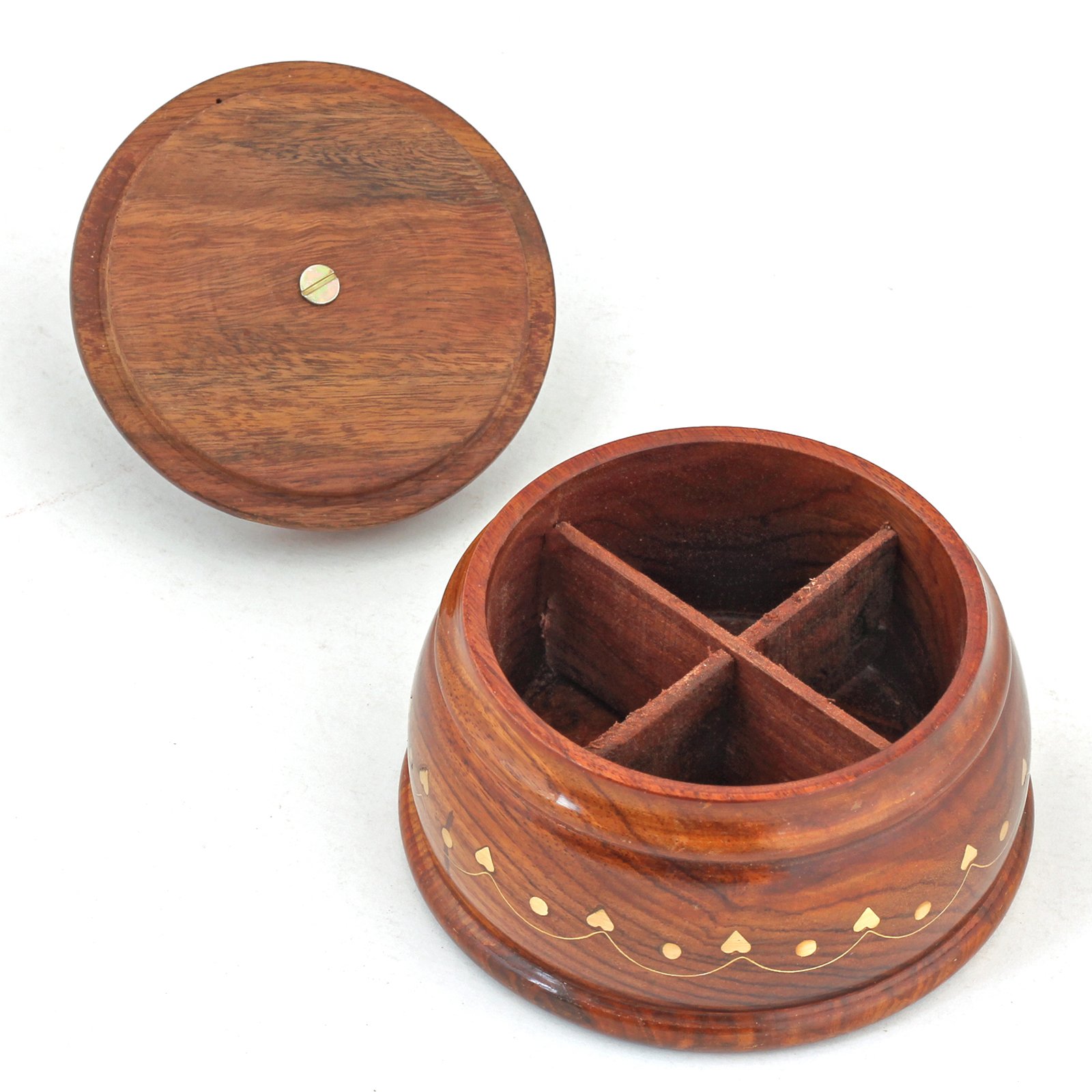 Wooden Dry Fruit Box Round with Brass Inlay Work on Top About The BrandVARANASI WOODEN TOYS Home & Lifestyle is establish in the year 2016. We are Manufacturer. Supplier Exporter of Wooden Handicrafts etc. We have perfect Indian handcrafts. We have skilled team of craftsmen. A design and development cell to execute our productions quality standards and their timely delivery. We provide full assistance in understanding our clients requirements with packing promotions logistics with very economic mode. Our Product are shipped all over the world. Our primary products are Wooden Items like Nesting Dolls Wooden card Holder Wooden Tray Home Decor Items and games like Tic Tac Toe and many more.Timely Delivery Top Quality Design & Delivery Assistance Satisfaction Guaranteed. We offer a wide range of wooden figures that come with a combination of polished finish. With the help of our skilled craftsman Our products find extensive usage in meeting the decoration demands of houses and other commercial establishments. With the support of qualified team of executives we are dedicatedly engrossed in presenting an exceptional Wooden products. Designed with precision these are made in line with the pre-defined standards set by the industry. Also these are tested rigorously before getting shipped at the premises of our customers.