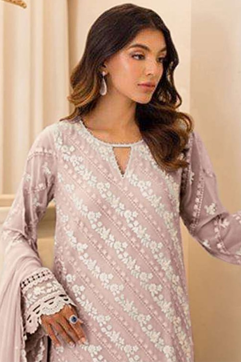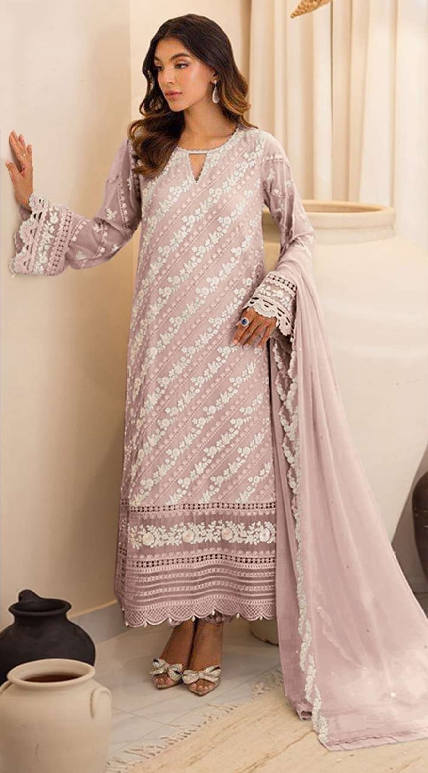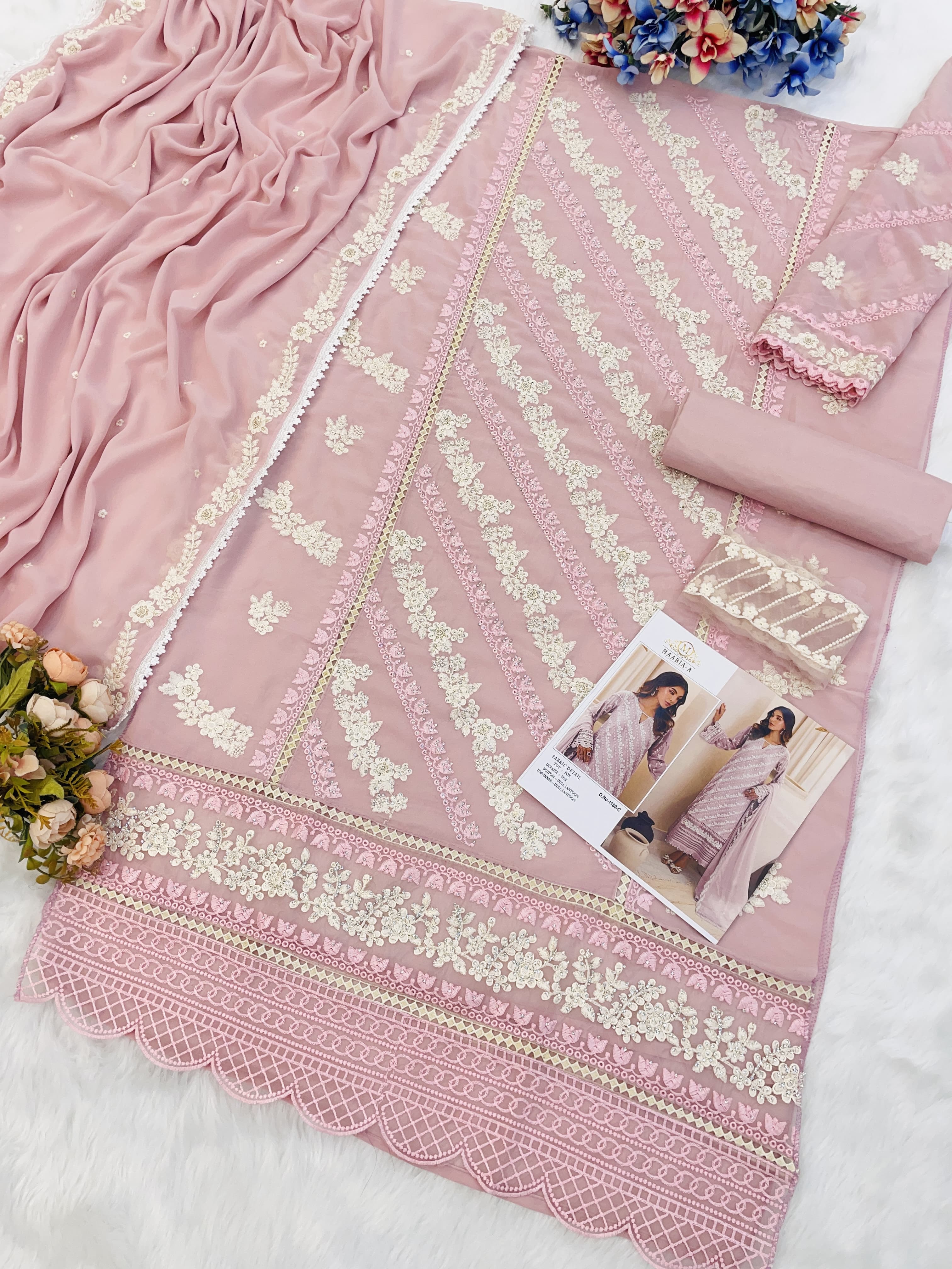 Baby Pink embroidered sequence work heavy fox georgette unstitched suit with zarkan