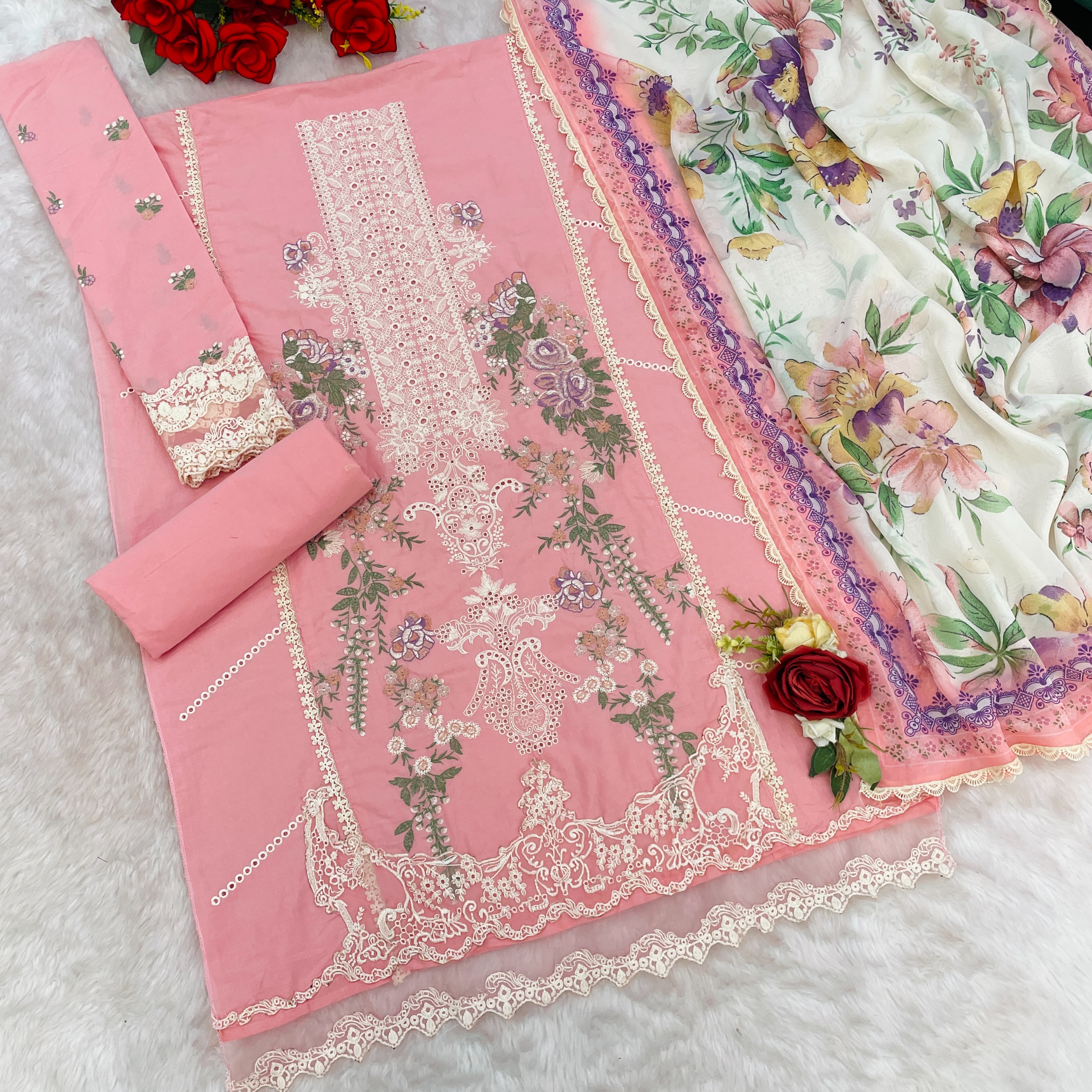 Baby Pink Embroidery Thread Work Cumbric Cotton Semi Stitched Salwar Suit