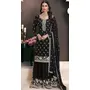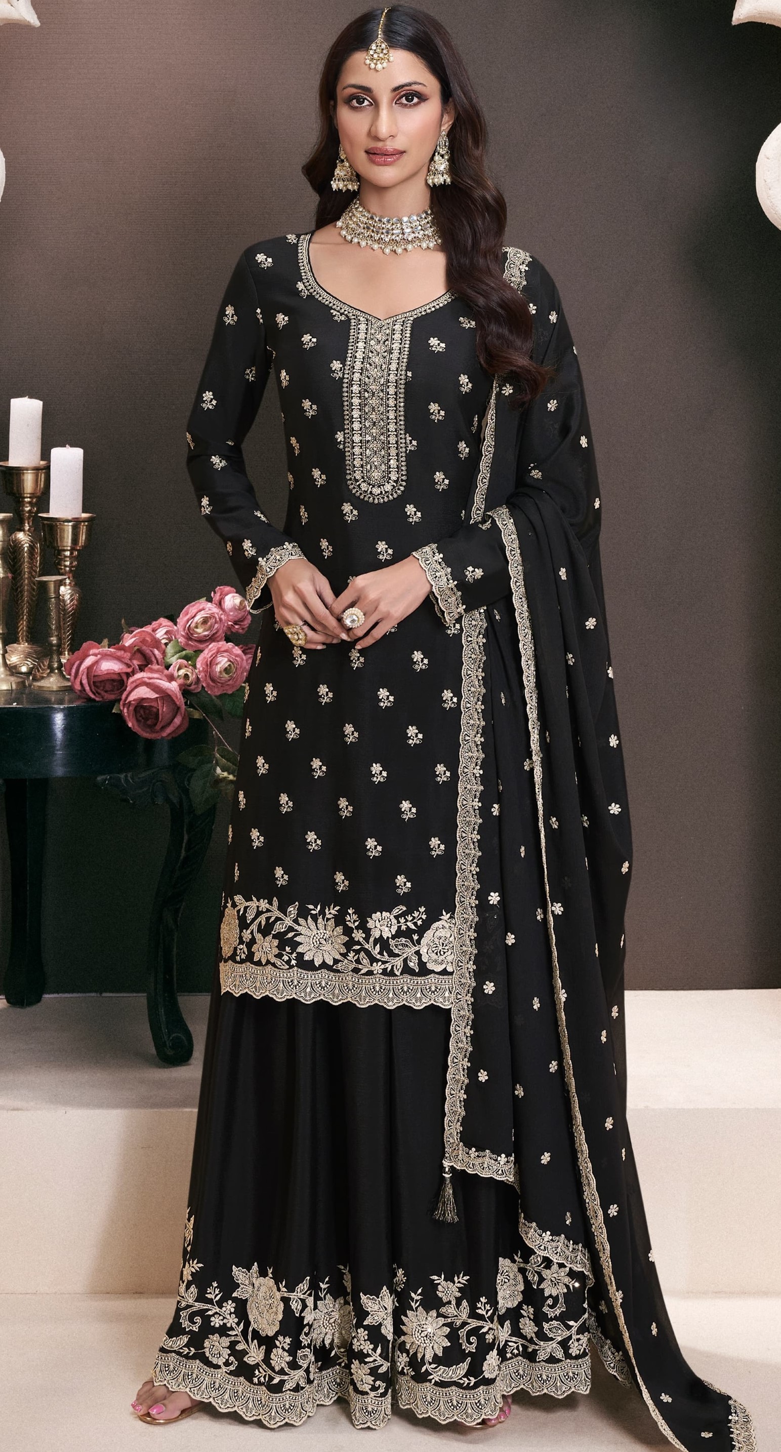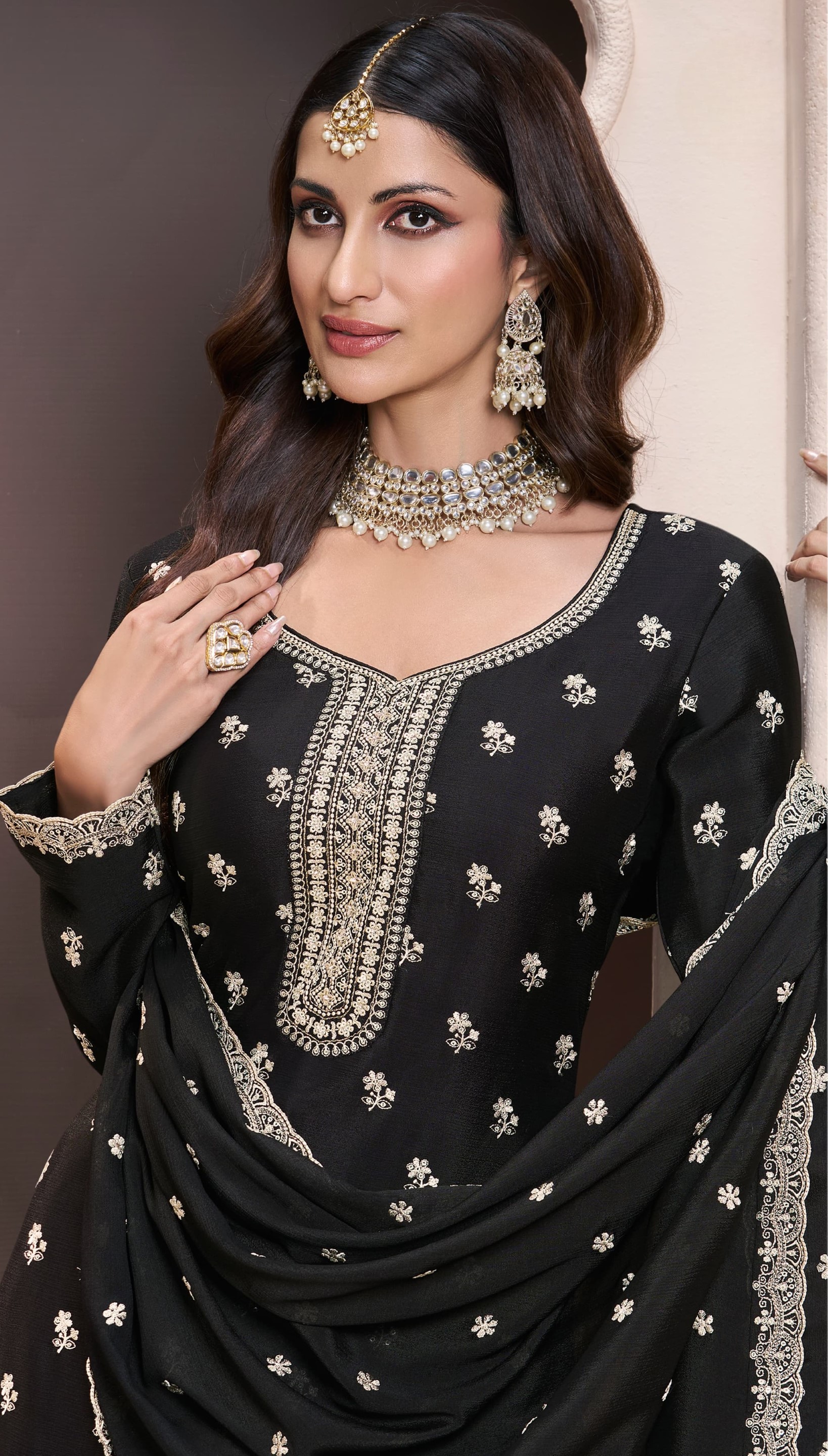 Black Chinon Embroidered Thread Work Semi-Stitched Salwar Suit