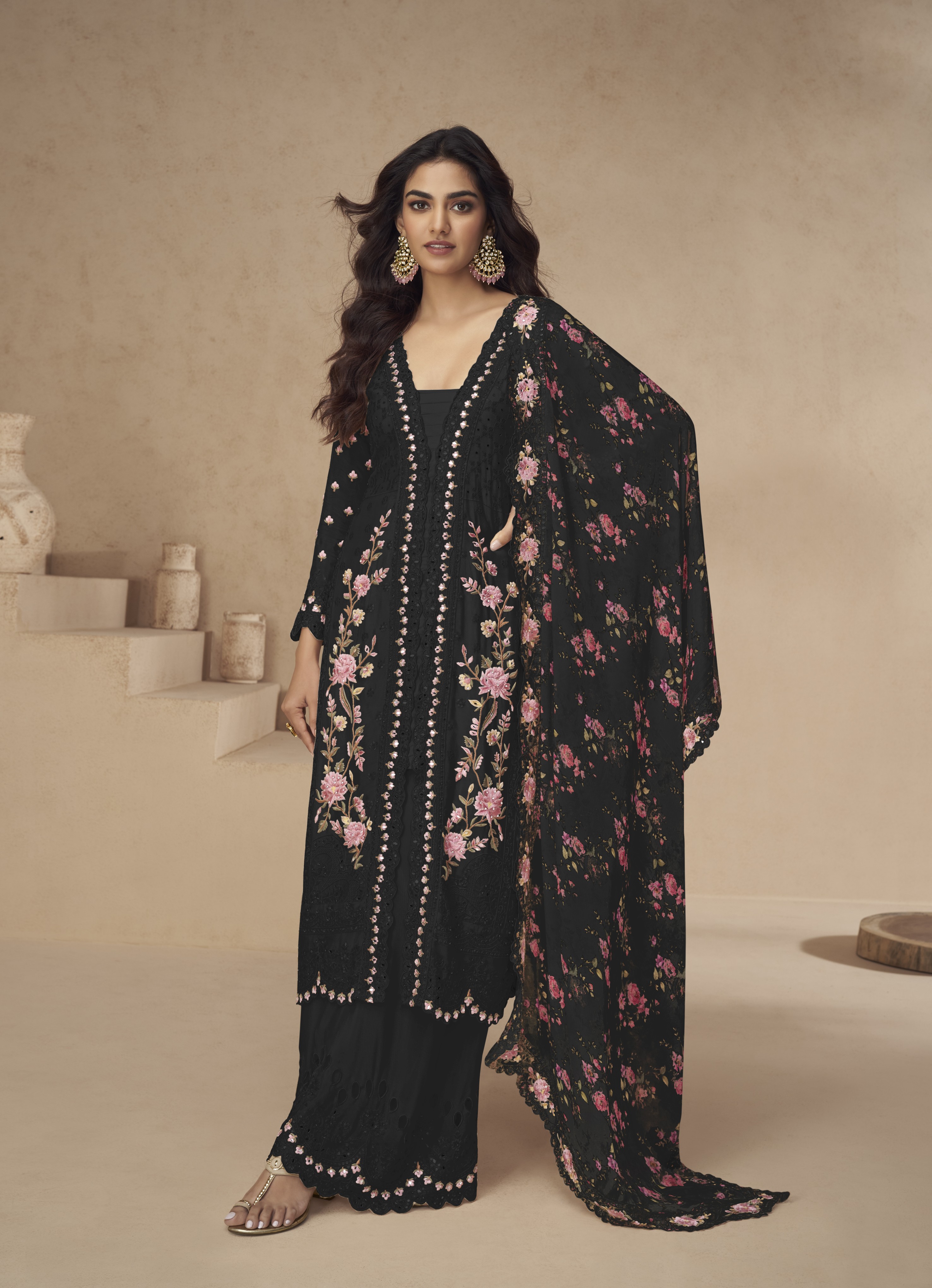 Black Chinon Readymade Suit with Embroidery Sequence Work
