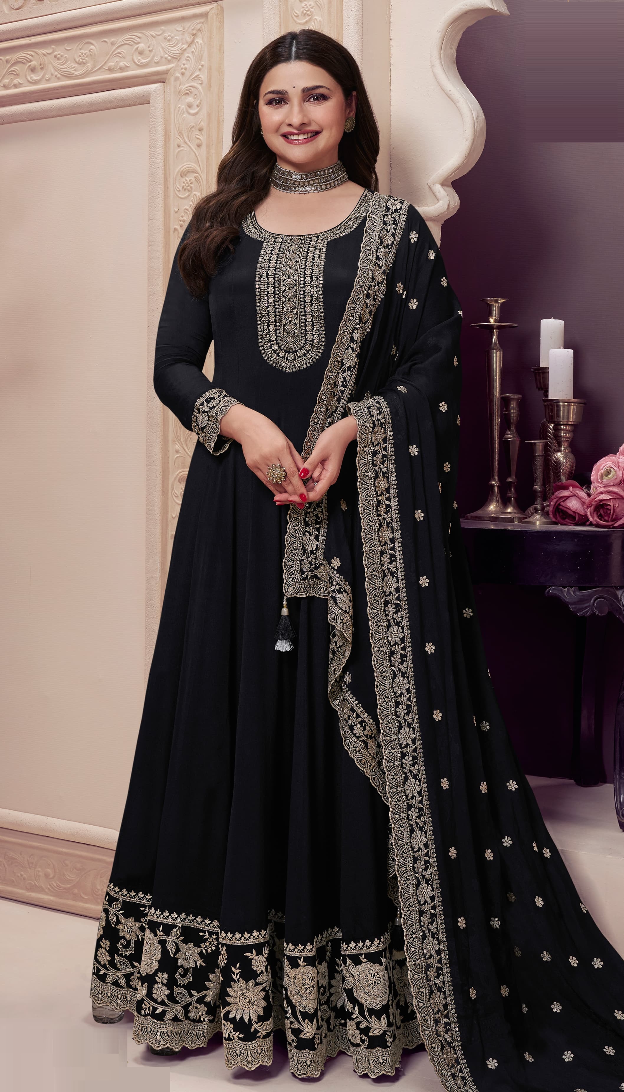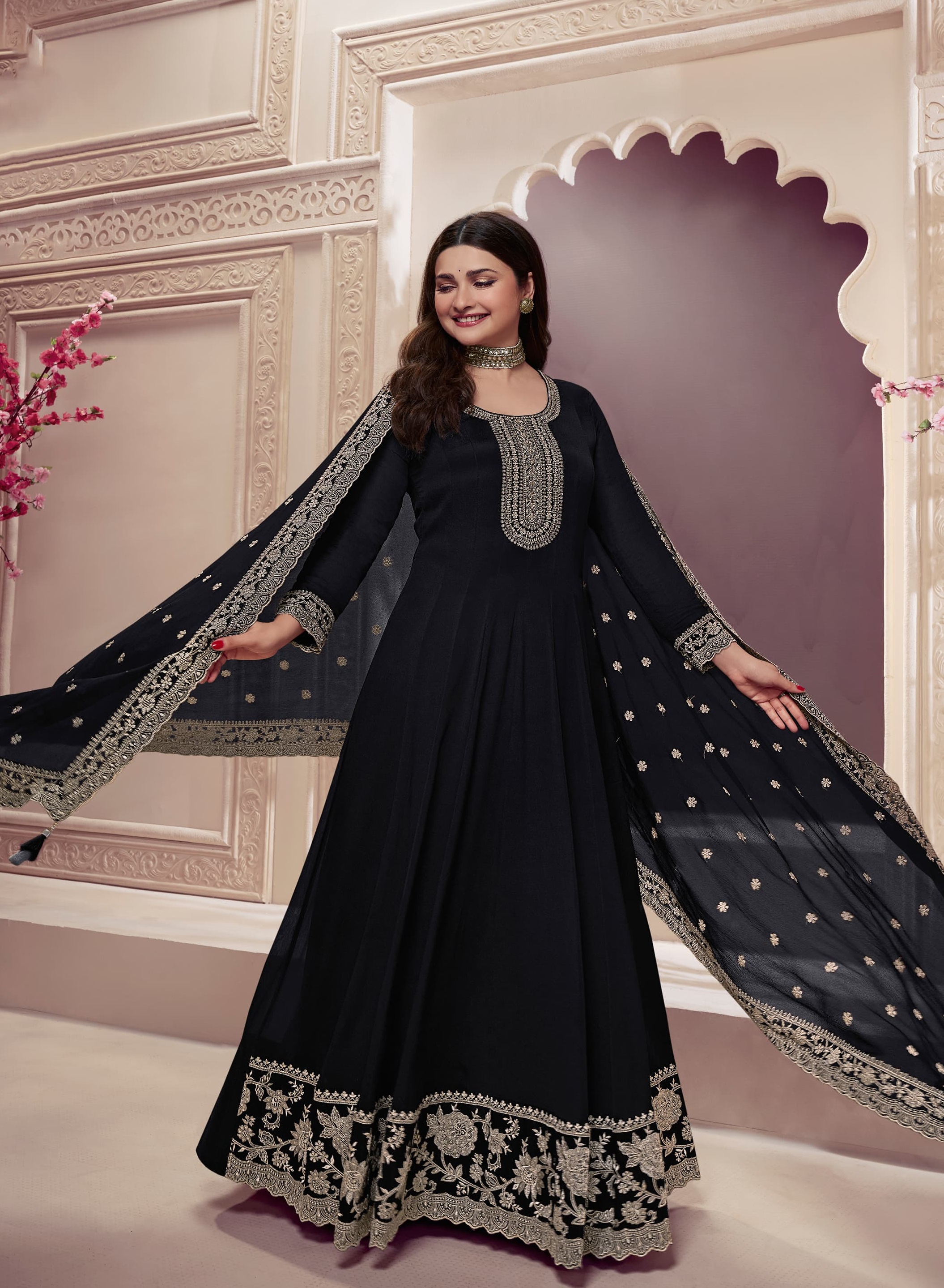 Black Embroderied Silk Semi-Stitched Anarkali Suit