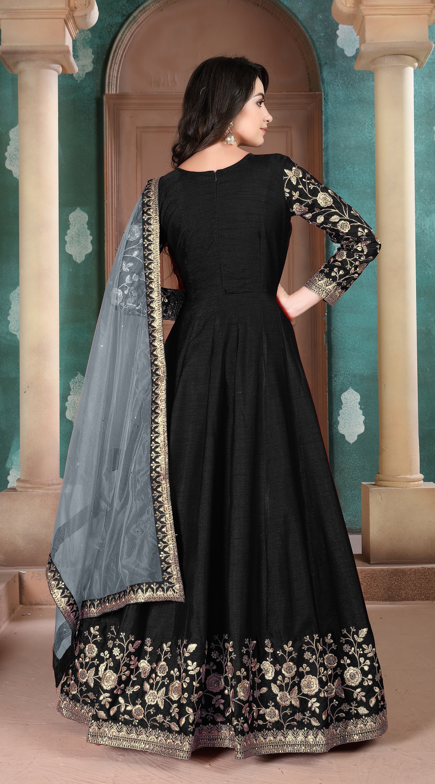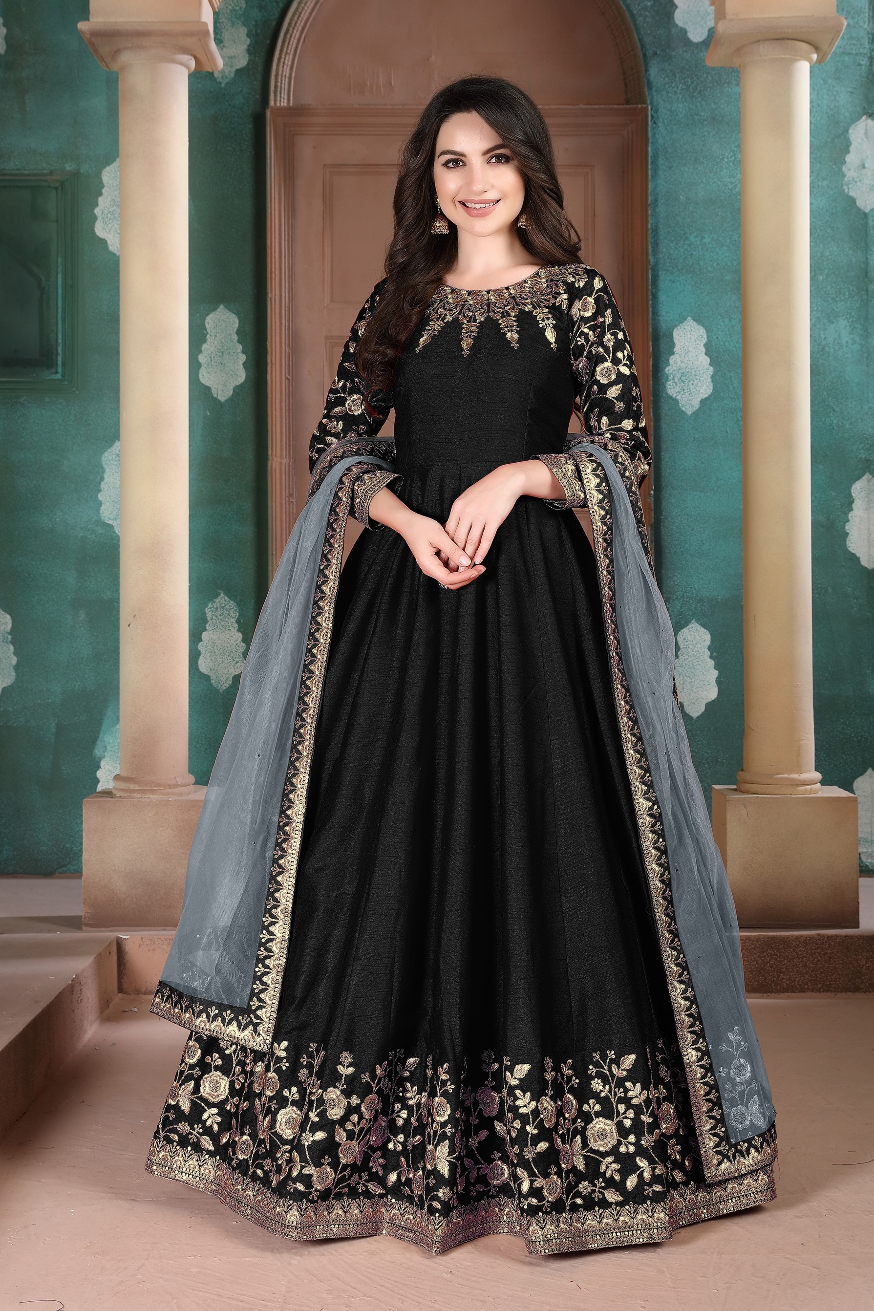 Black Embroidered Adda Silk Semi Stitched Anarkali Suit