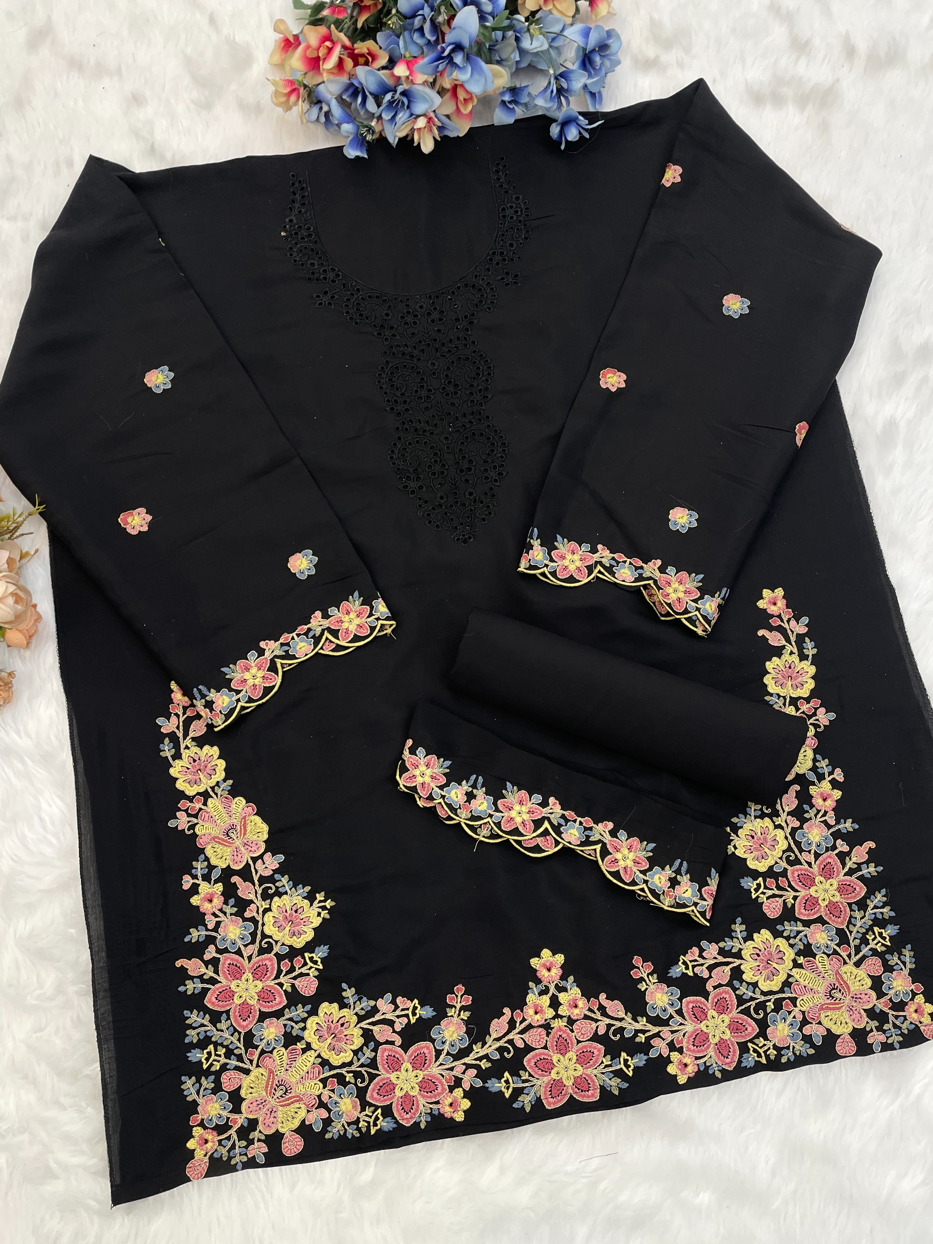 Black Embroidered and Viscose Thread work Cotton Semi Stitched Salwar Suit