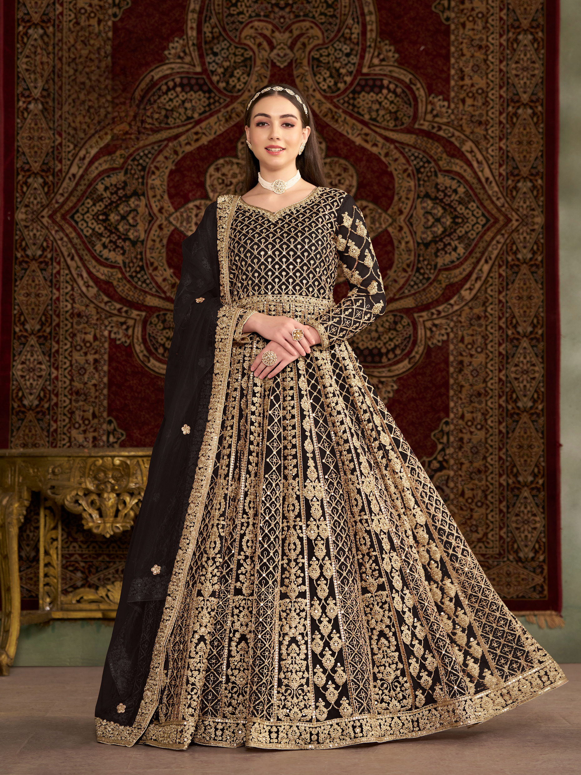 Black Embroidered Net Semi Stitched Anarkali Suit