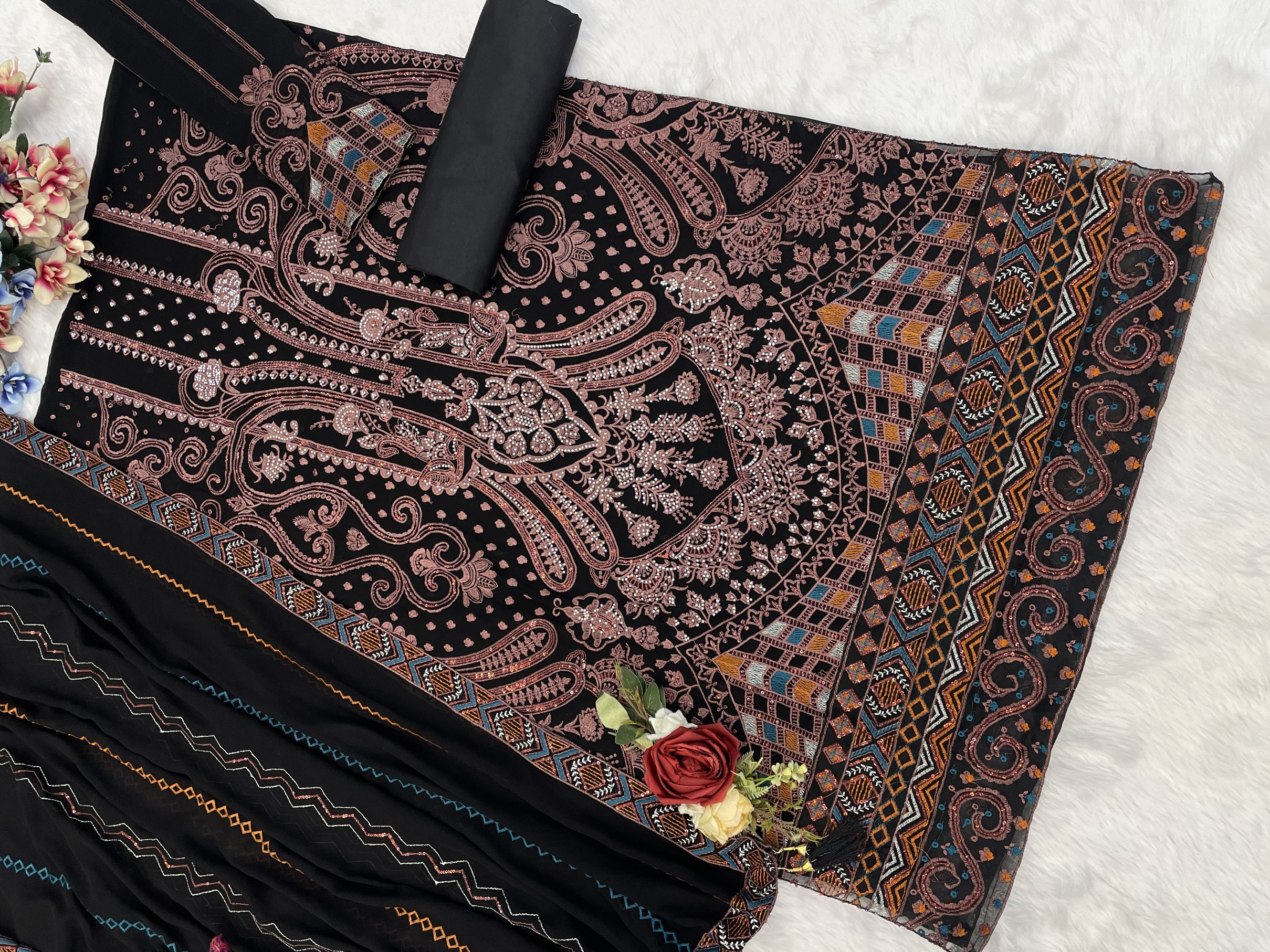 Black Georgette Semi Stitched Suit with Embroidered & Multi Thread Zarkan Work