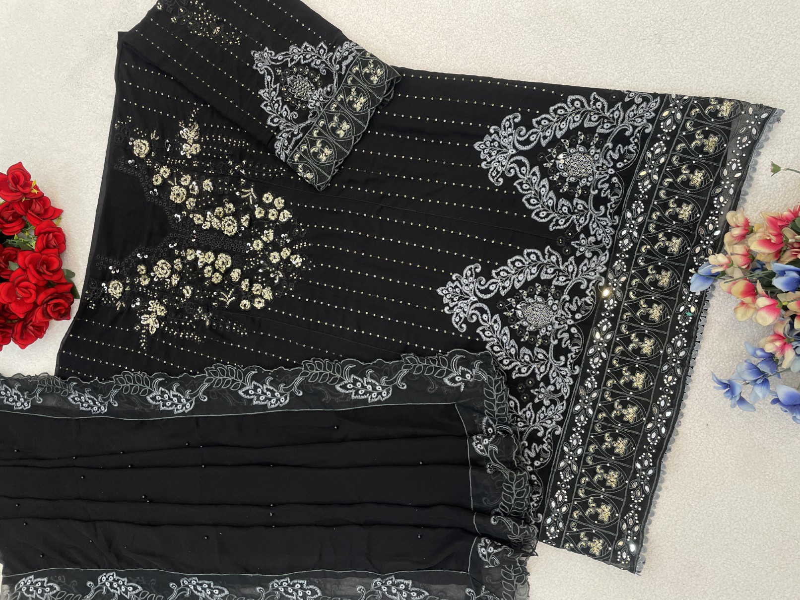 Black Georgette Semi Stitched Suit with Embroidered Sequence & Khatli Work