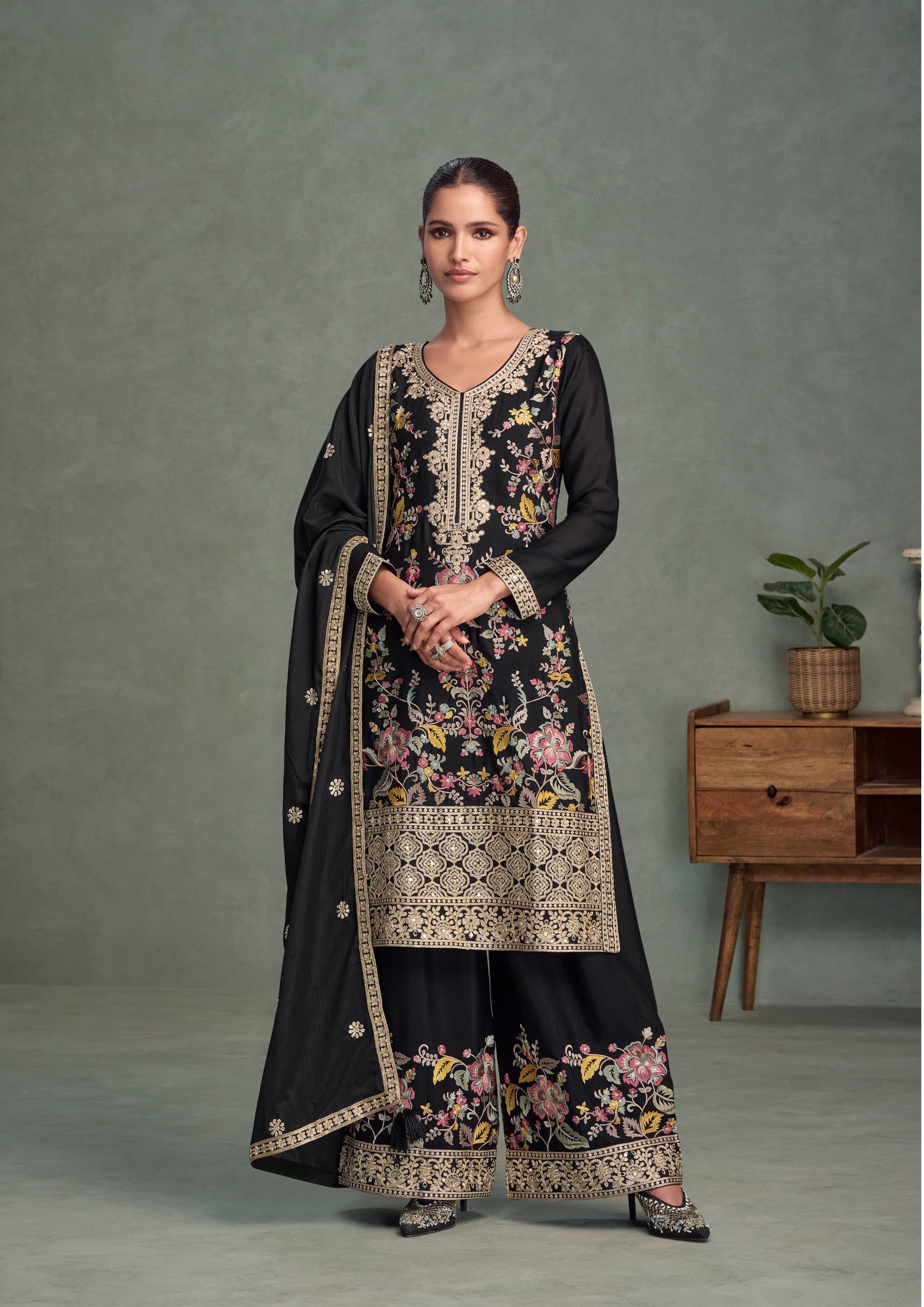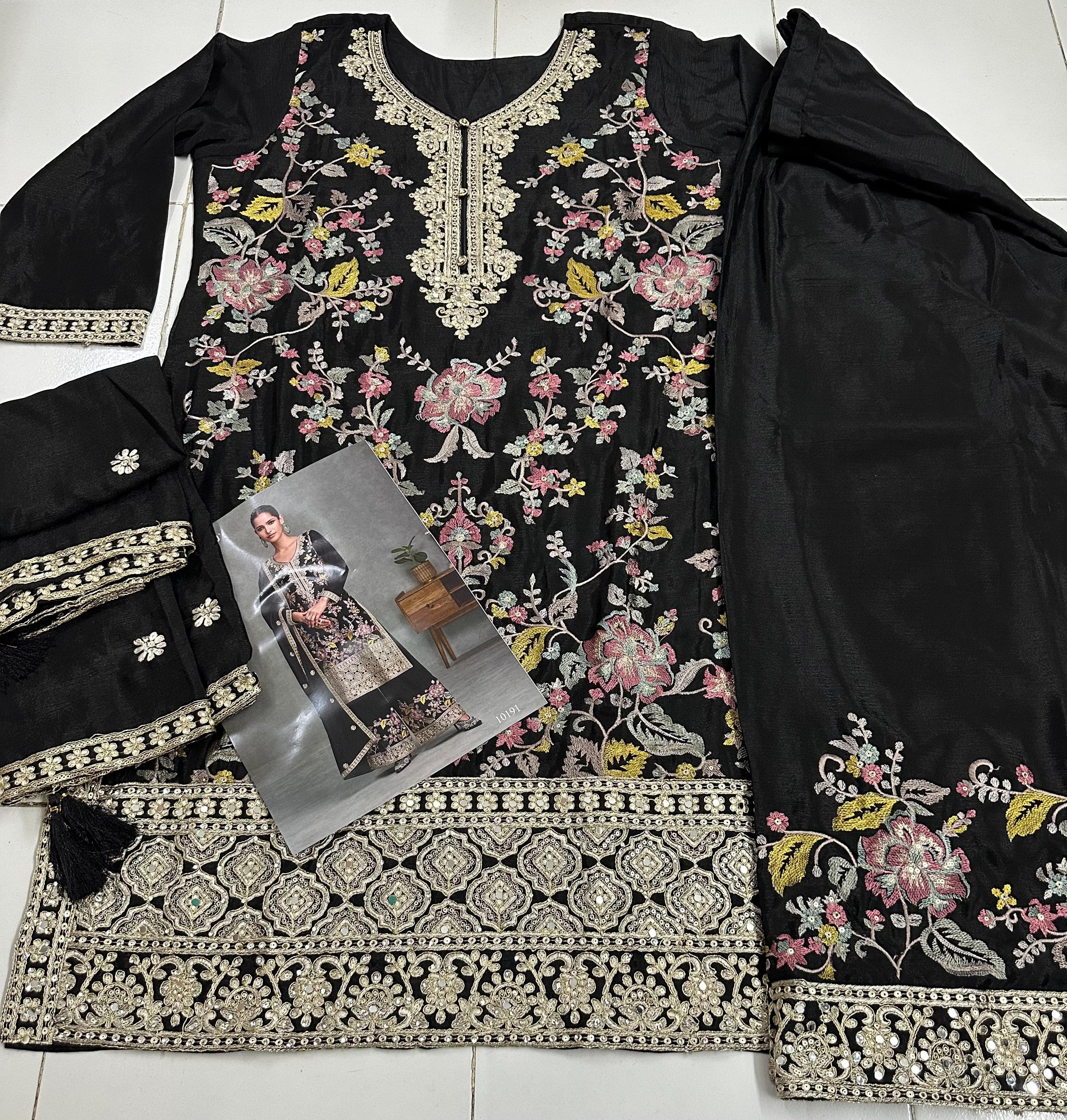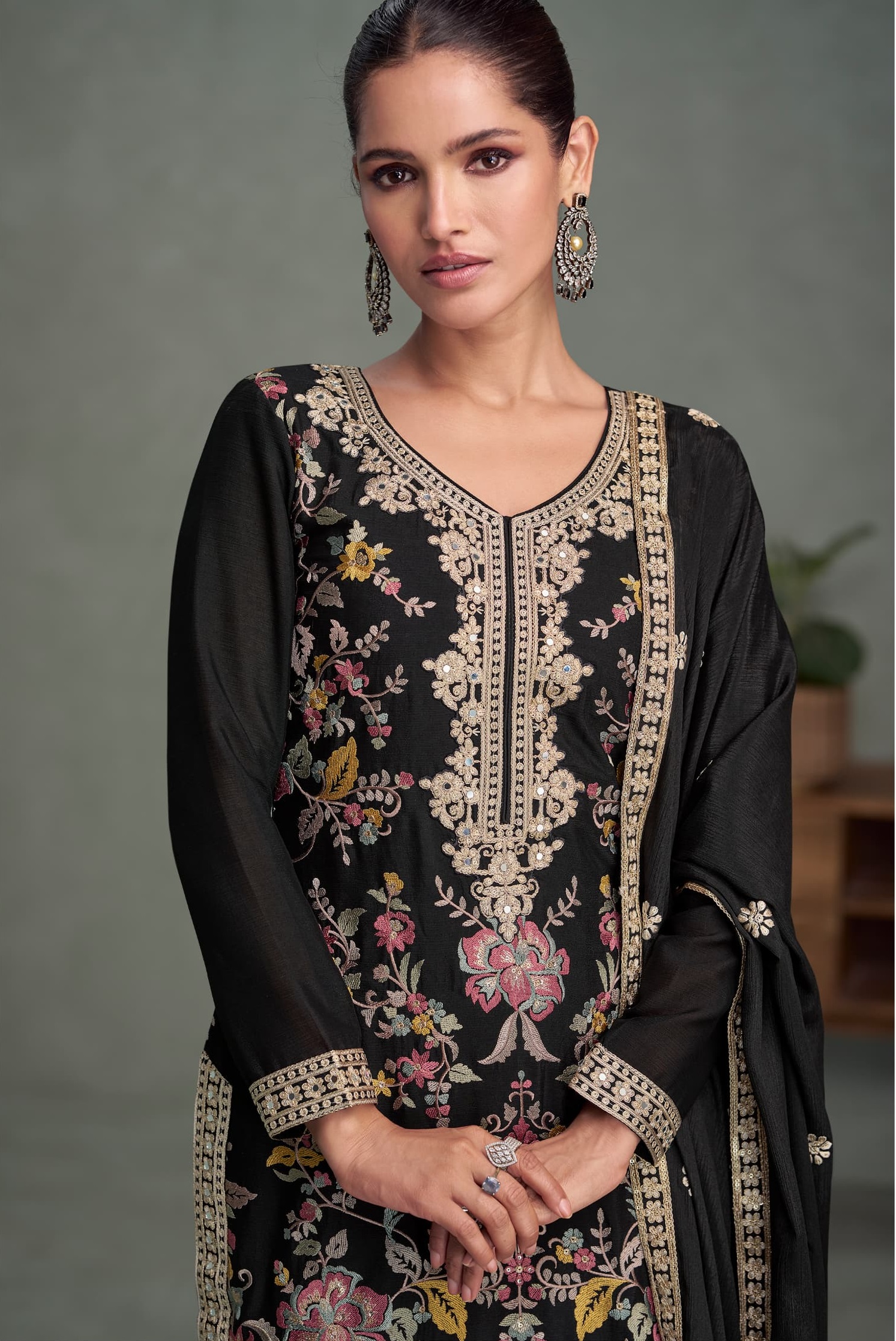 Black Multi Thread & Sequence Embroidery Work Chinon Free Size Stitched Salwar Suit