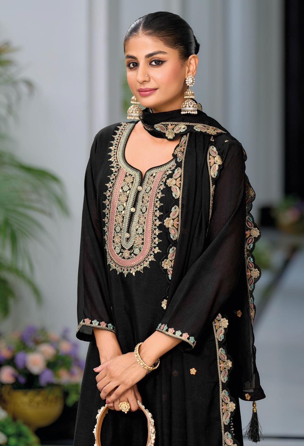 Black Premium Embroidered Chinon Readymade Salwar Suit (Free Size)