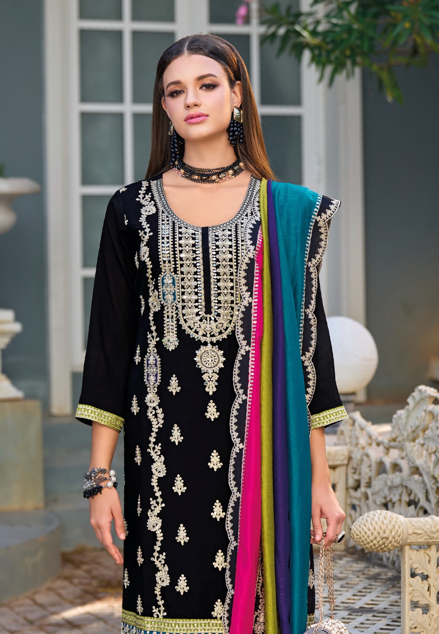 Black Premium Embroidered Chinon Semi Stitched Salwar Suit