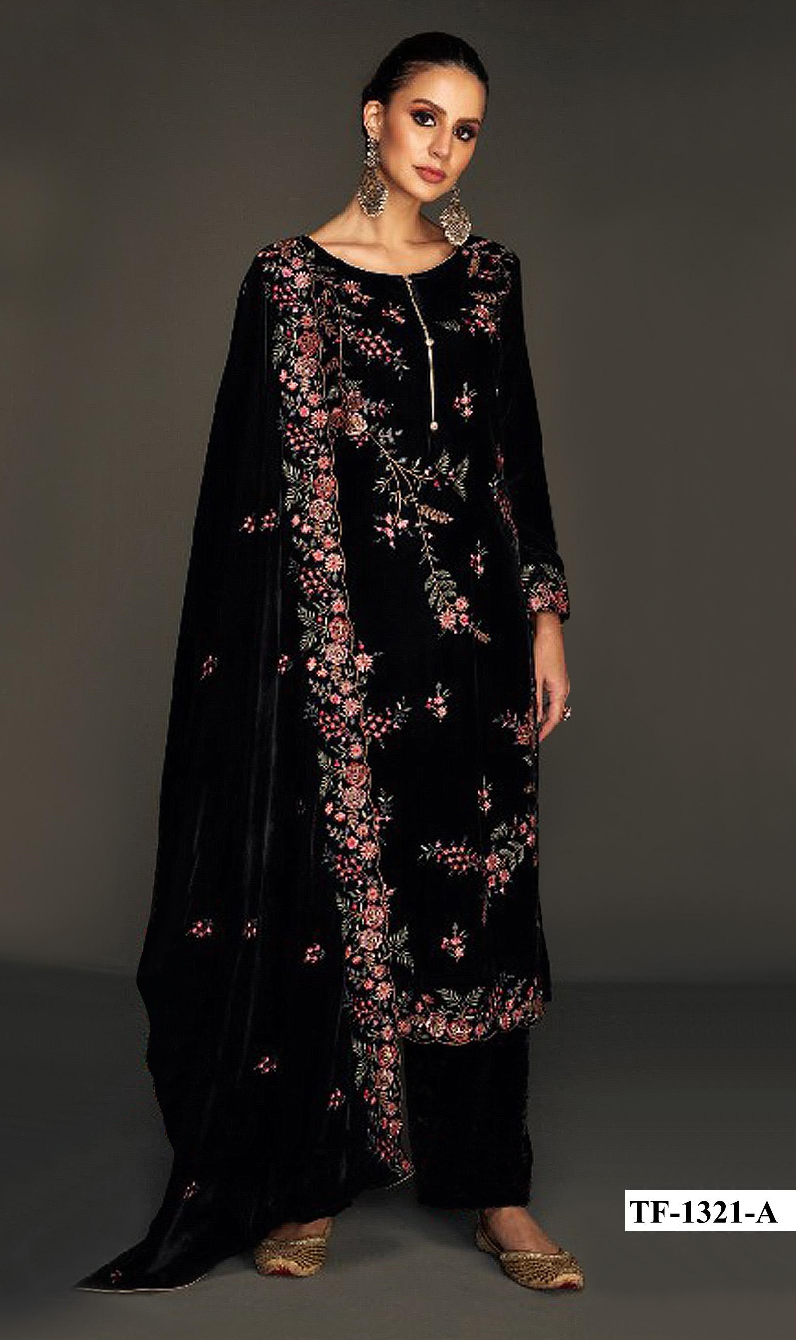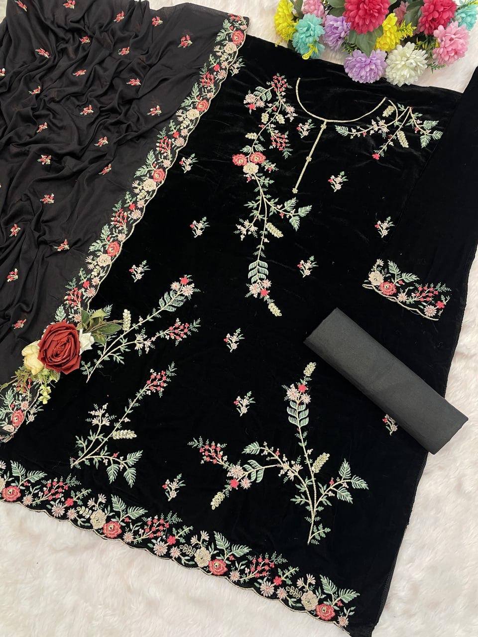 Black Pure Velvet Semi Stitched Suit with Heavy Embroidery Sequence Work