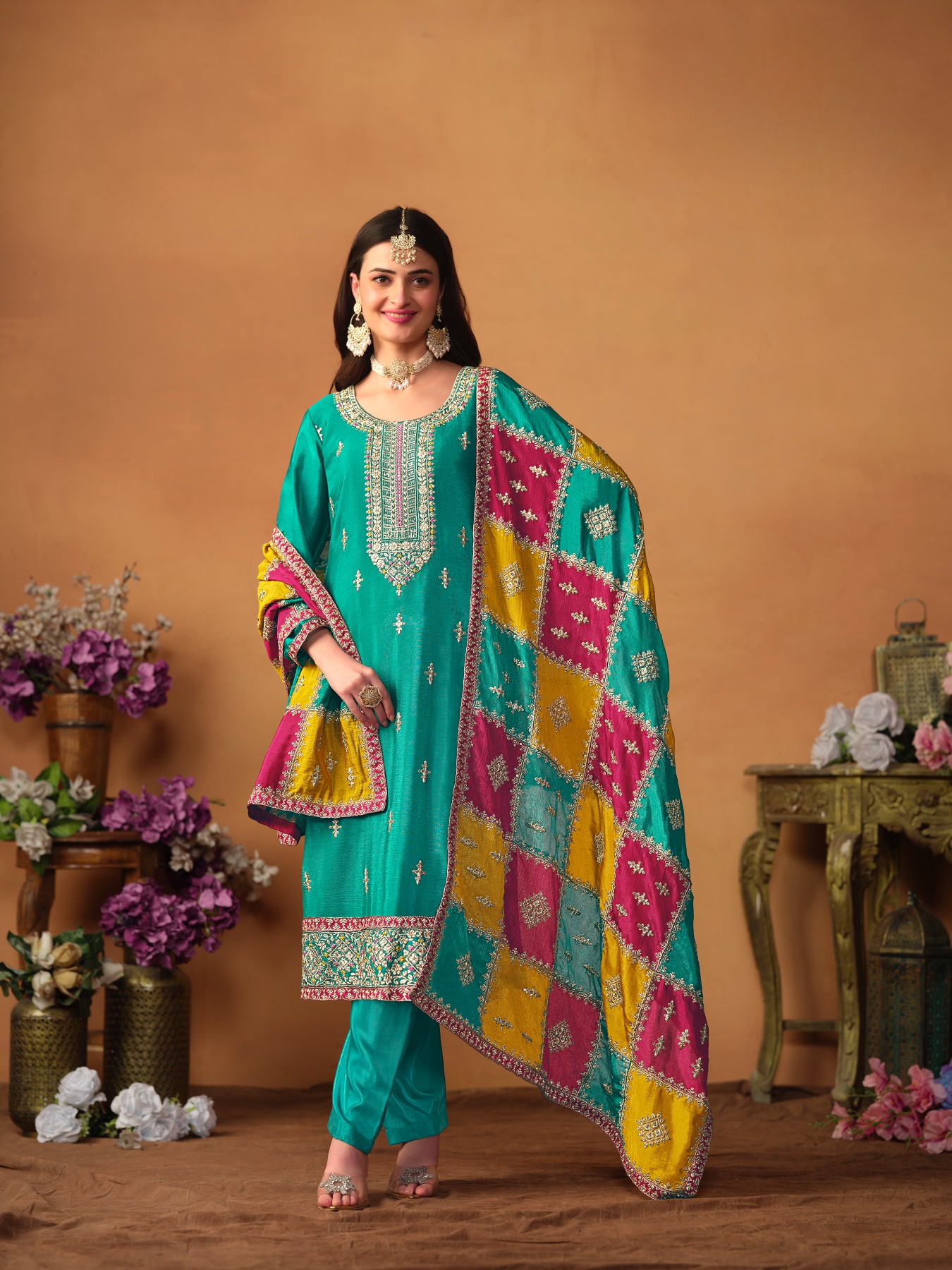 Blue Embroidered Soft Organza Semi Stitched Salwar Suit
