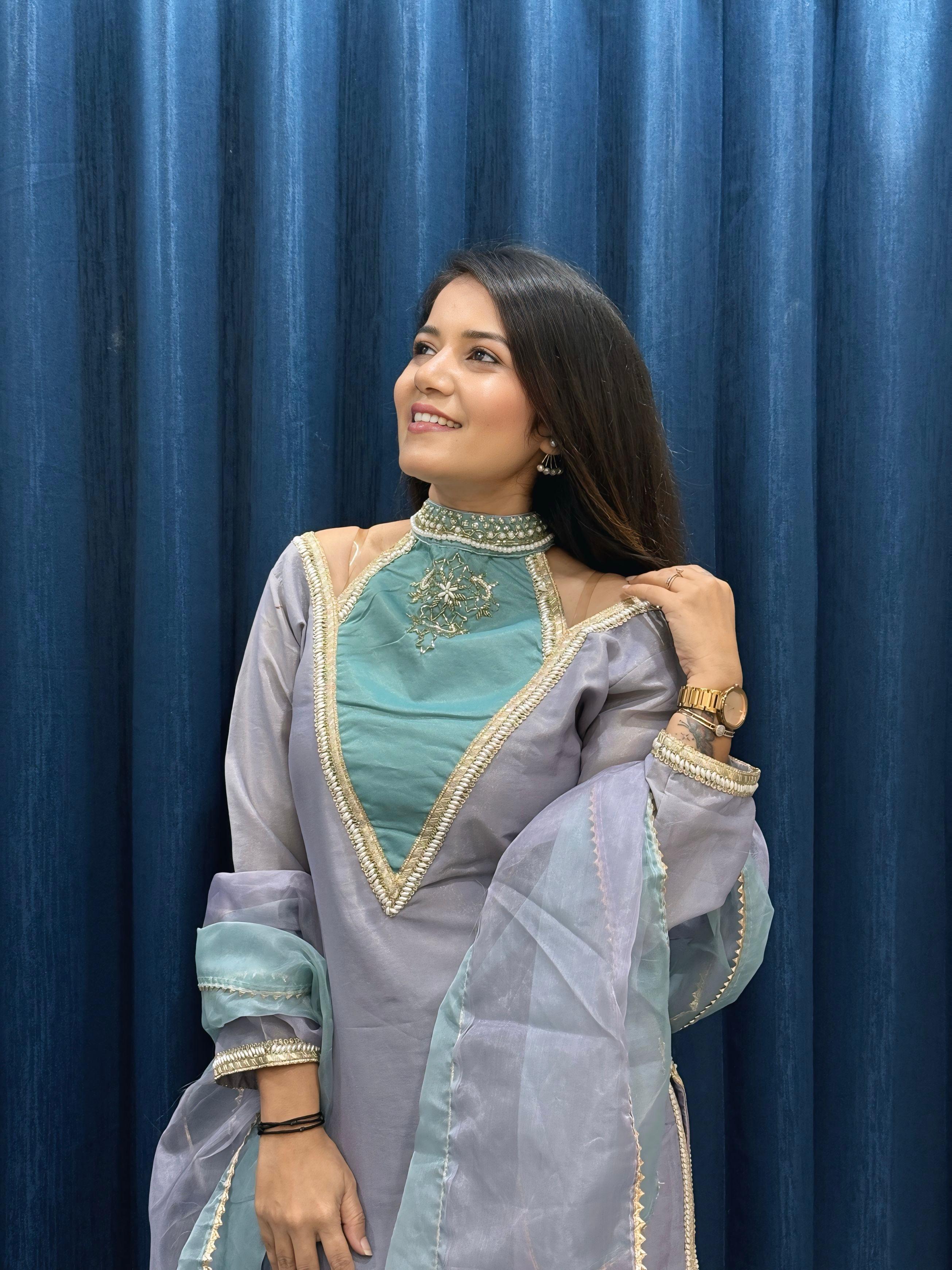 Blue Roman Shimmer Readymade Kurti Set with Designer Handwork