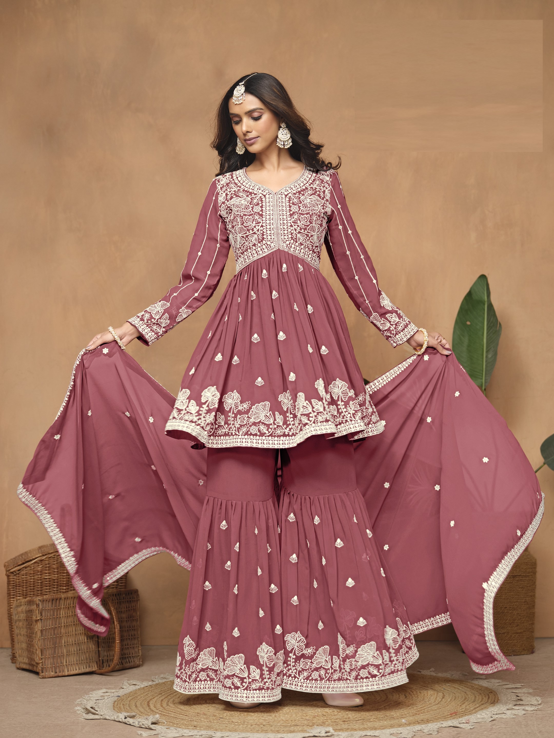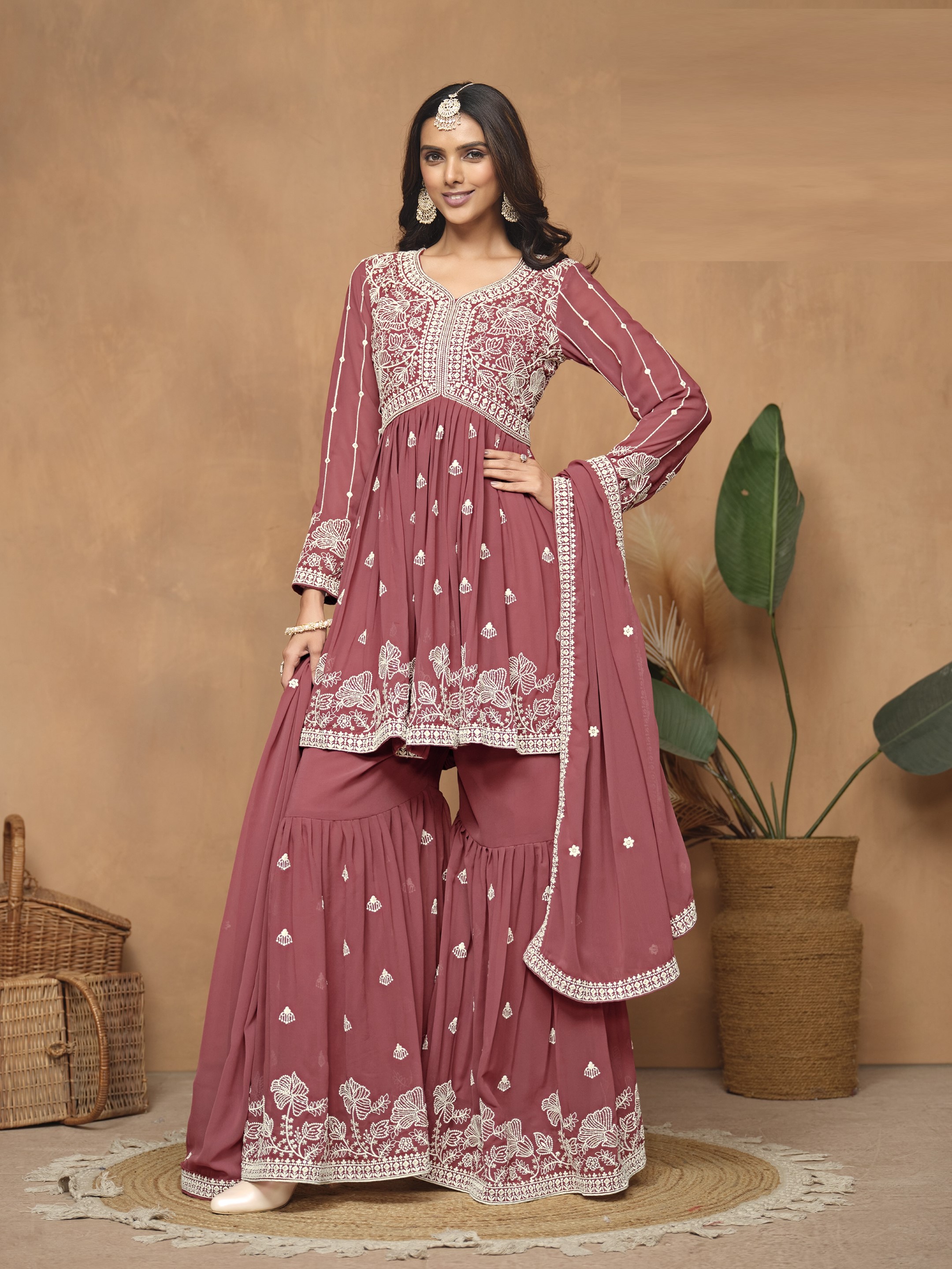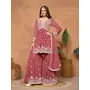 Brown Embroidered Faux Georgette Semi Stitched Sharara Suit