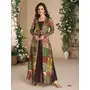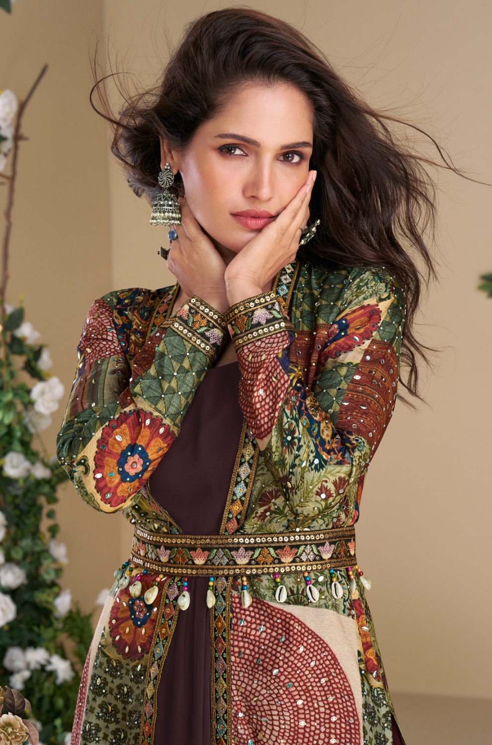Brown heavy fox georgette free size anarkali shrug suit with silk print
