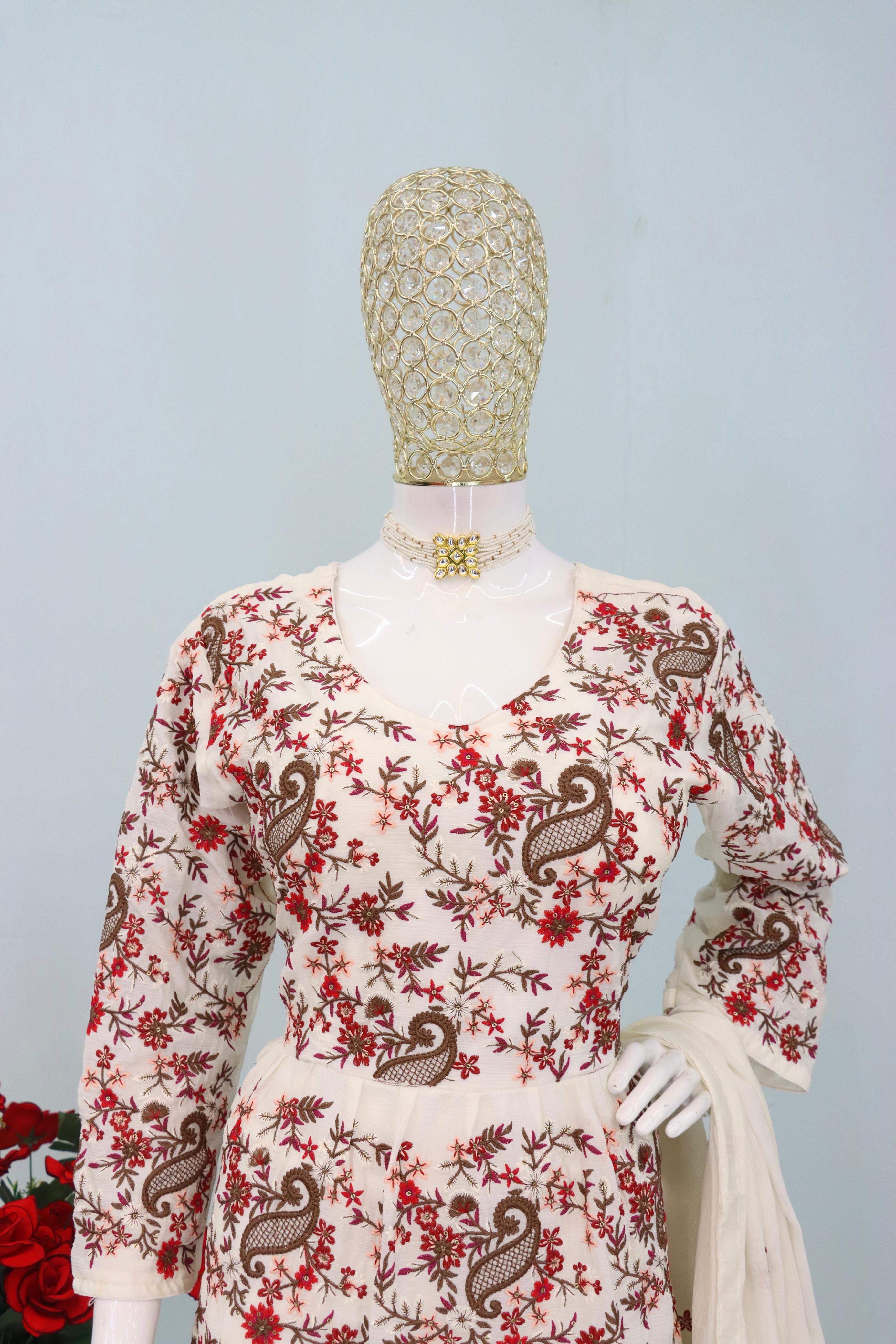 Cream Chinon Embroidered With Squence Work Free Size Salwar Suit