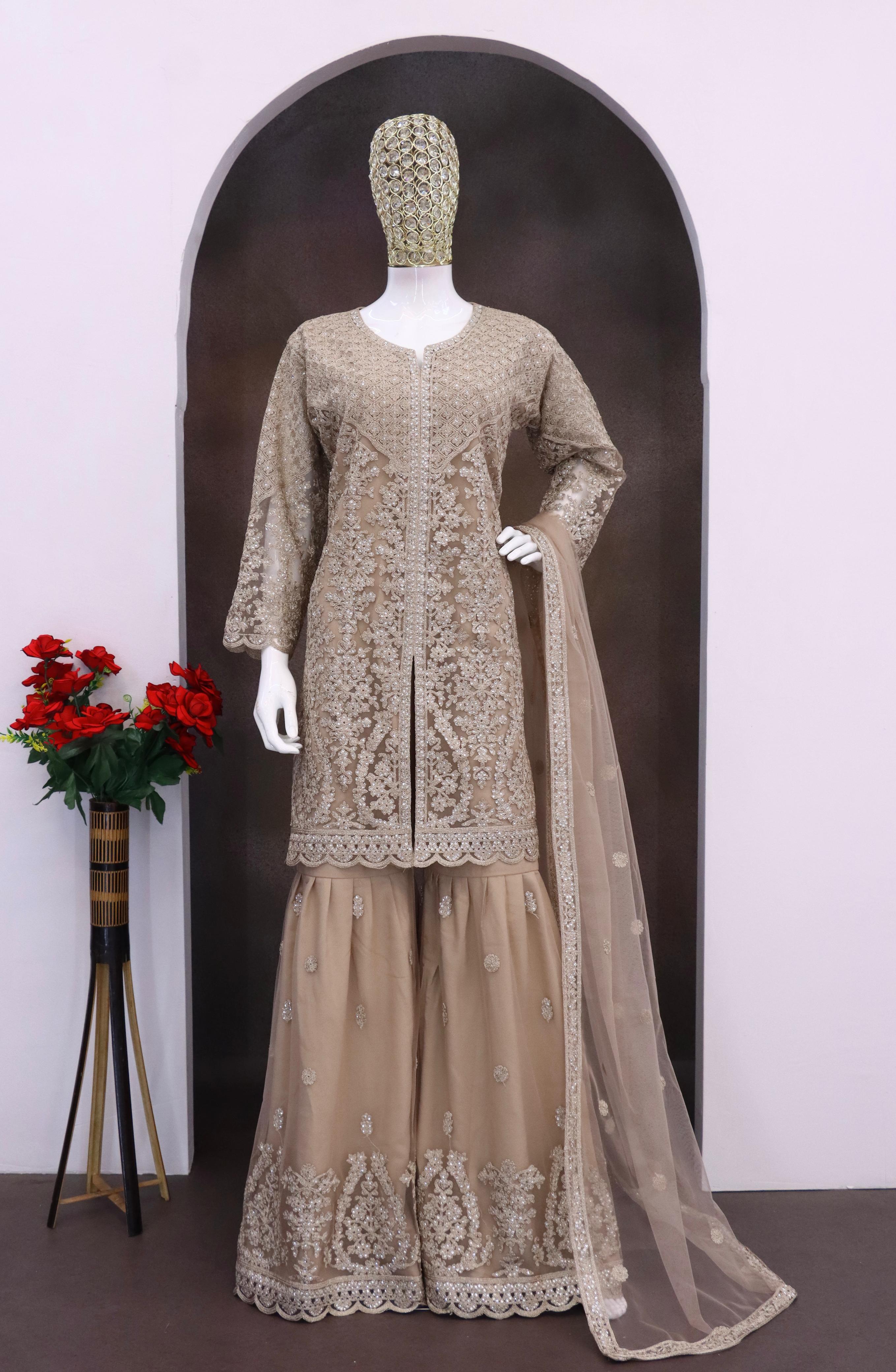 Cream Heavy Net Readymade Suit with Embroidery & Sequence Work