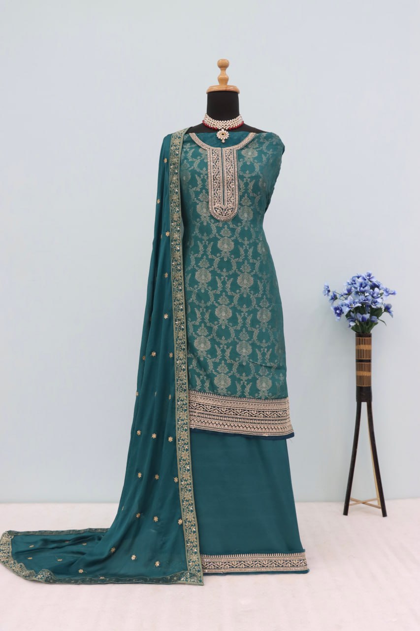Dark Green Dola Silk Thread Sequence Embroidered Semi-Stitched Salwar Suit