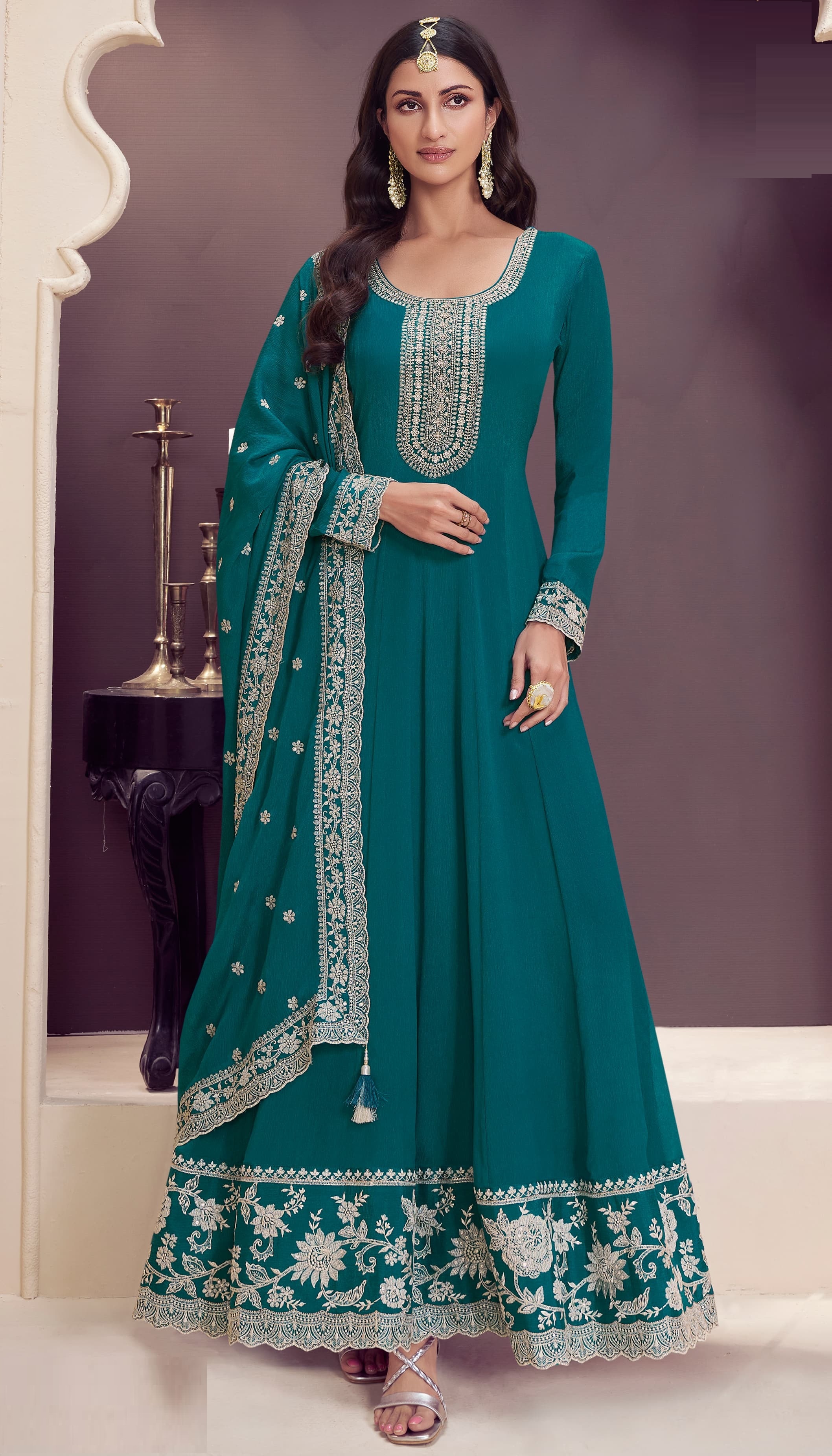 Dark Green Embroderied Silk Semi-Stitched Anarkali suit