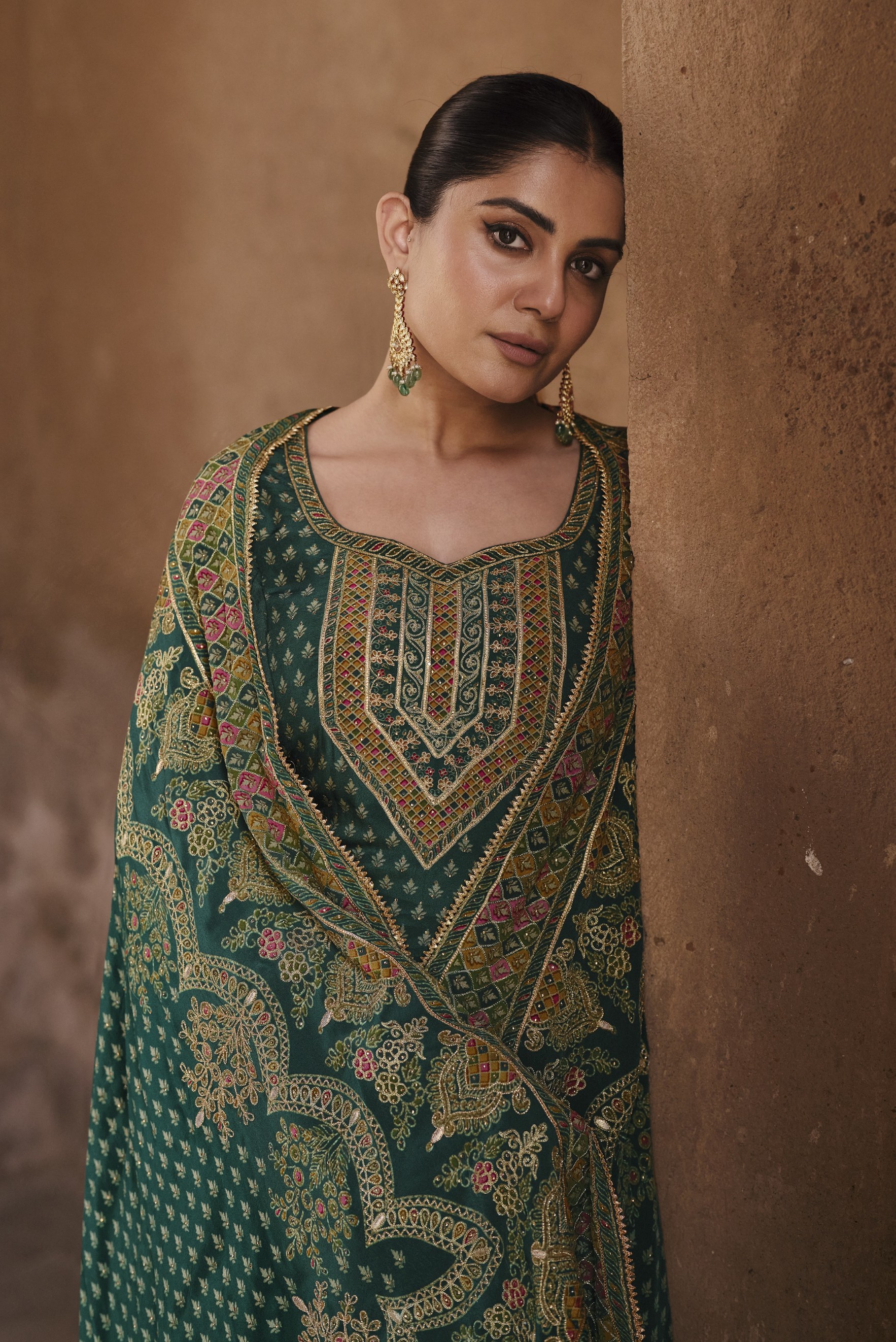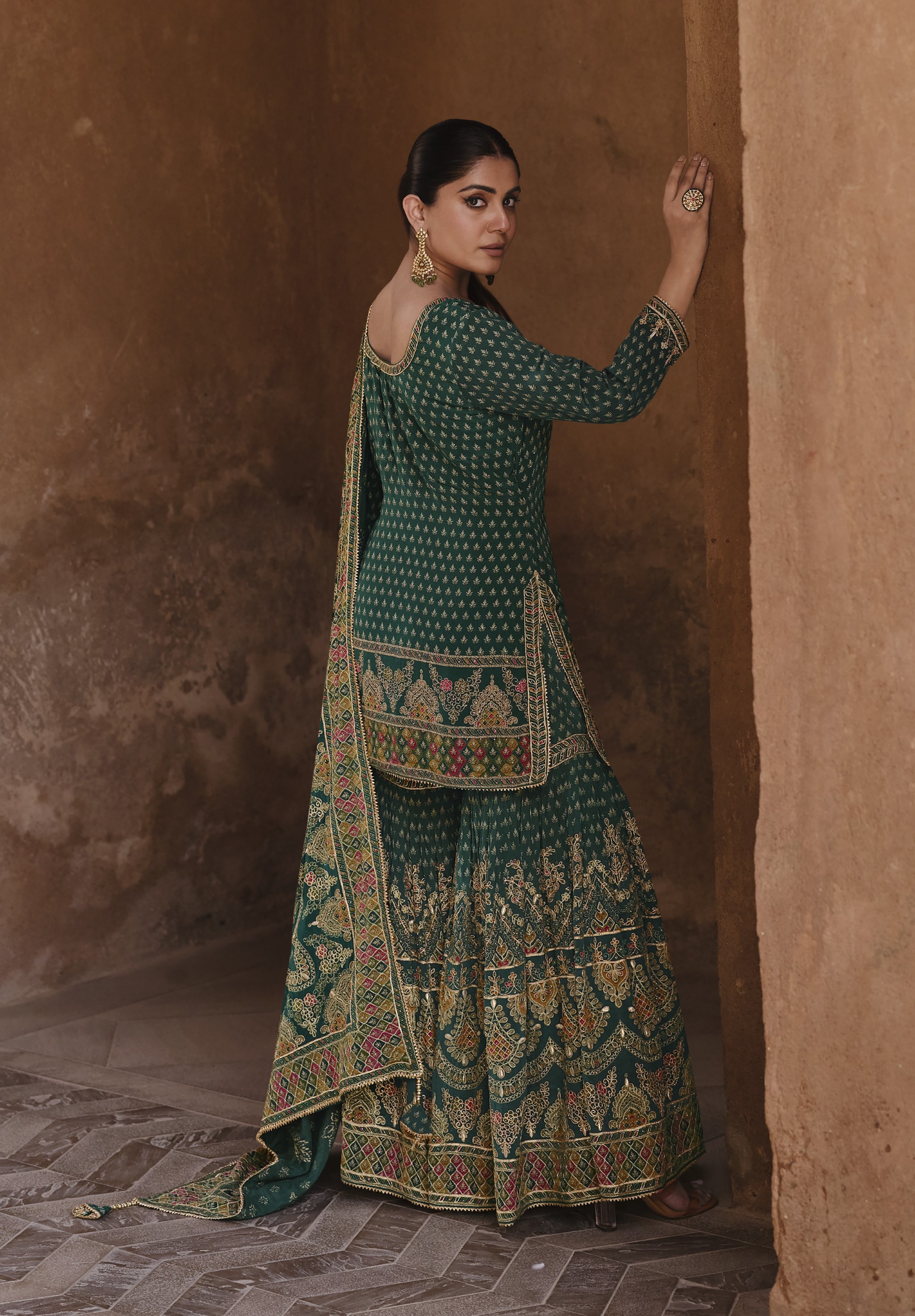 Dark-Green Silk Readymade Palazzo Suit with Swarovski Work