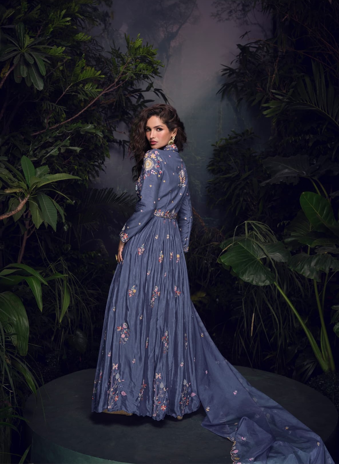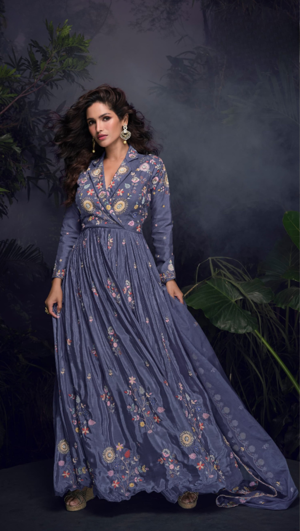 Dark lavender heavy chinon with embroidery stitched gown (free size)