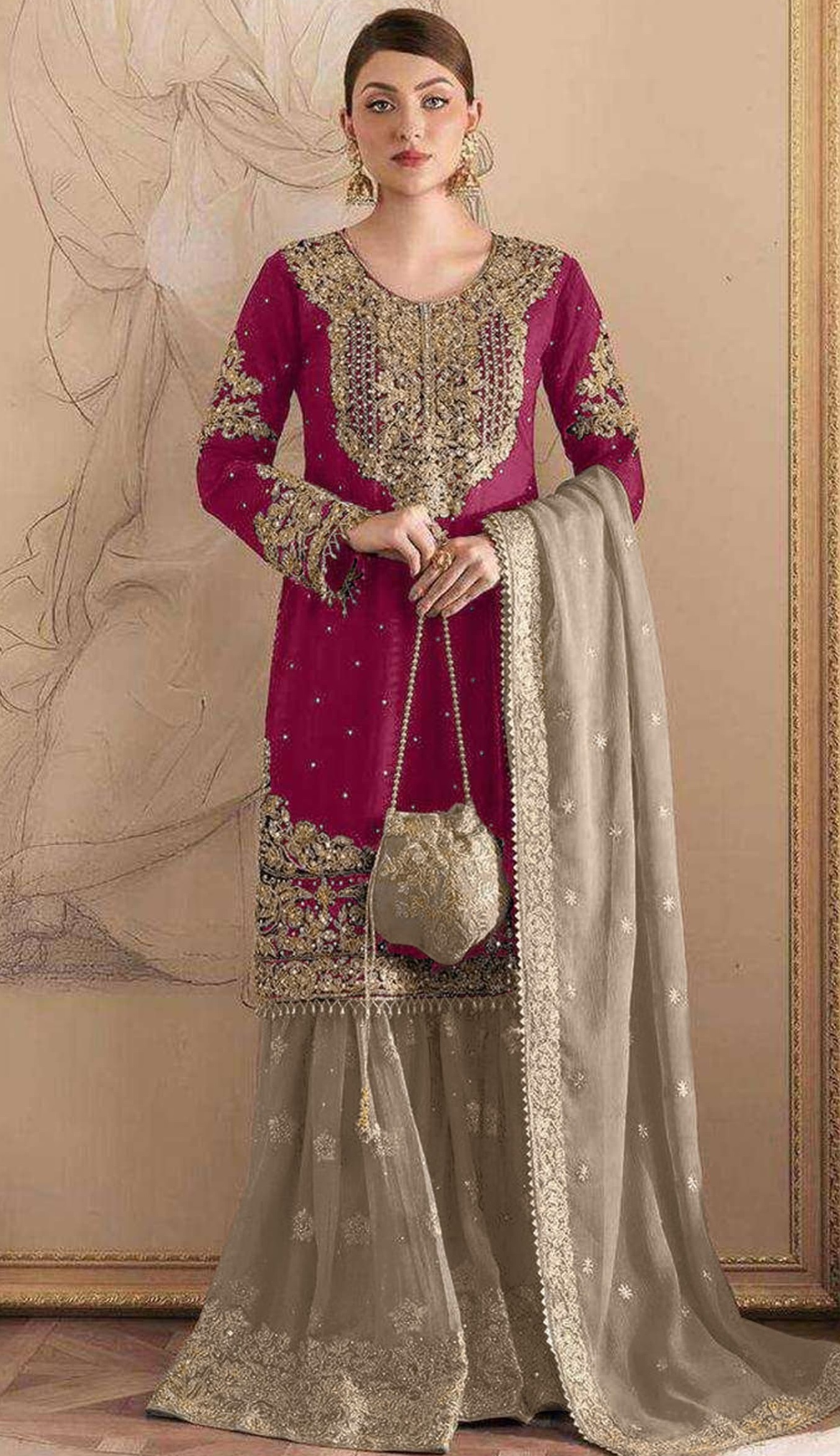 Dark pink Embroidered Faux Georgette with Sequence Work Semi Stitched Sharara Suit