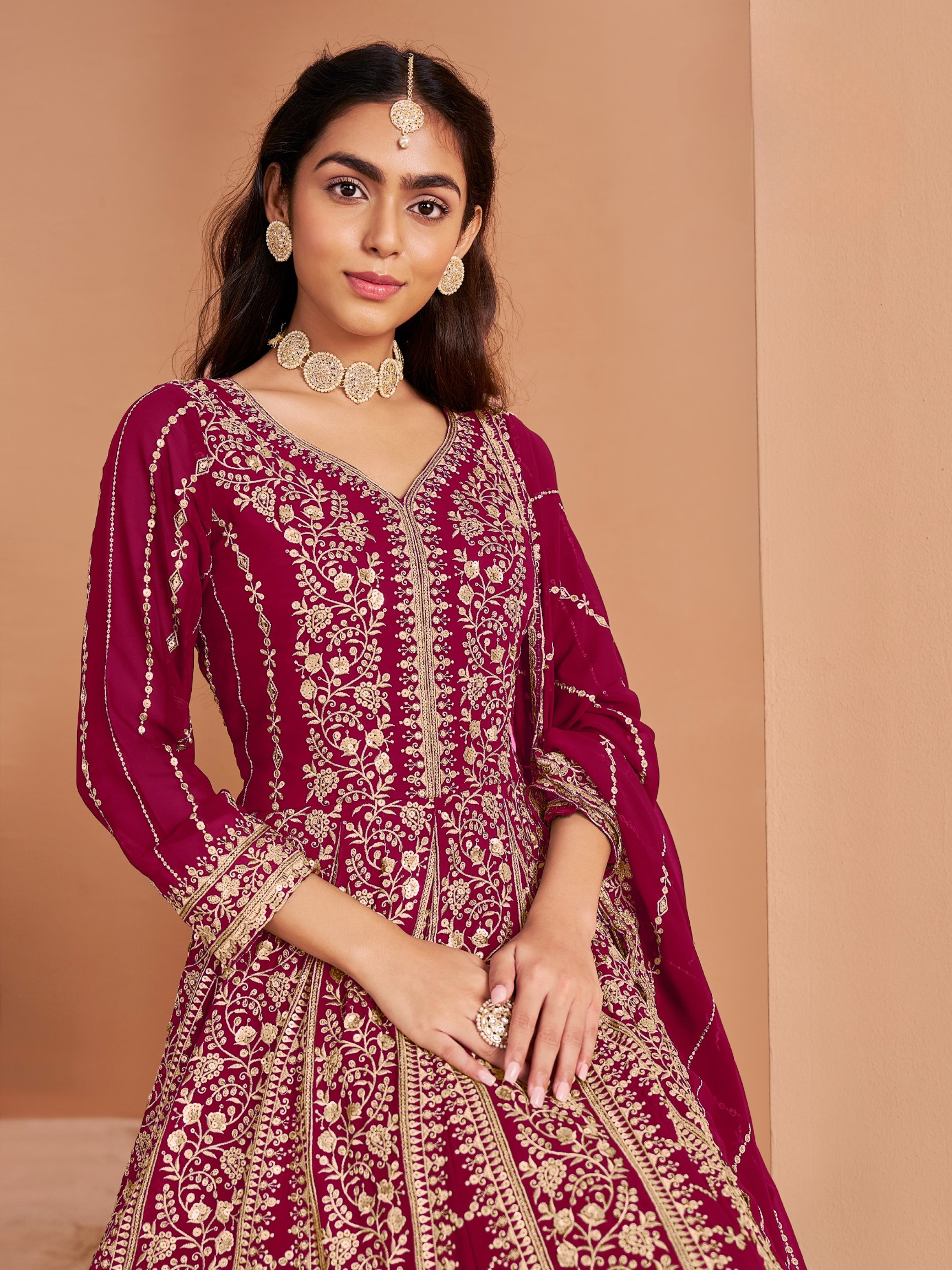 Dark Pink Georgette Embroidered Semi Stitched Salwar Suit