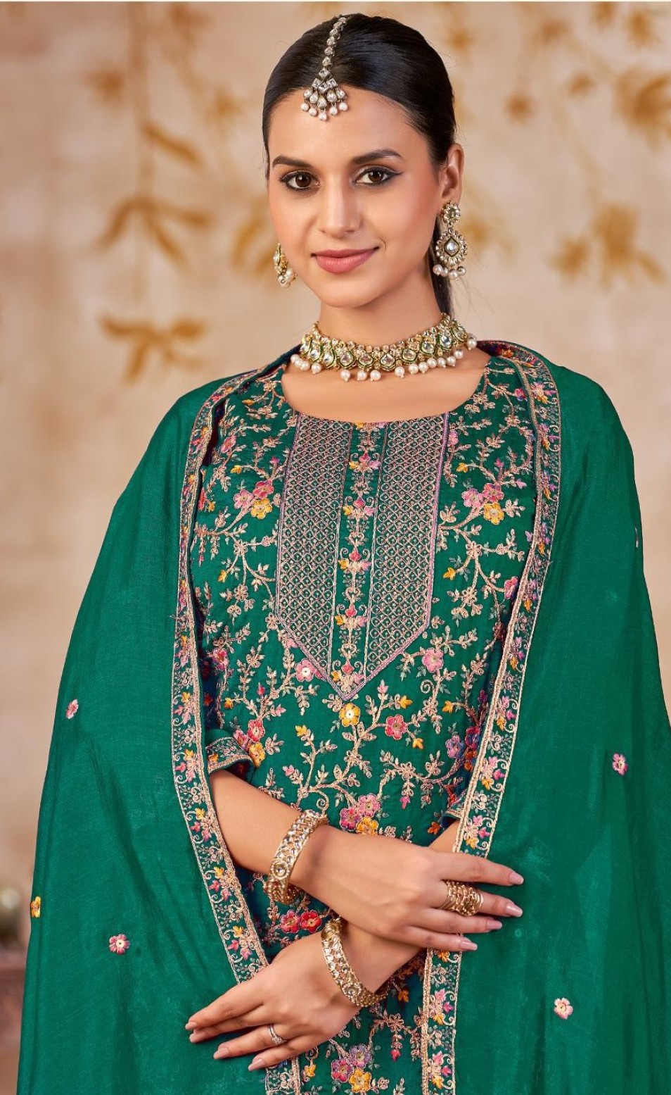 Emerald Vichitra Silk Readymade Plazzo Suit with Embroidery & Lace Work