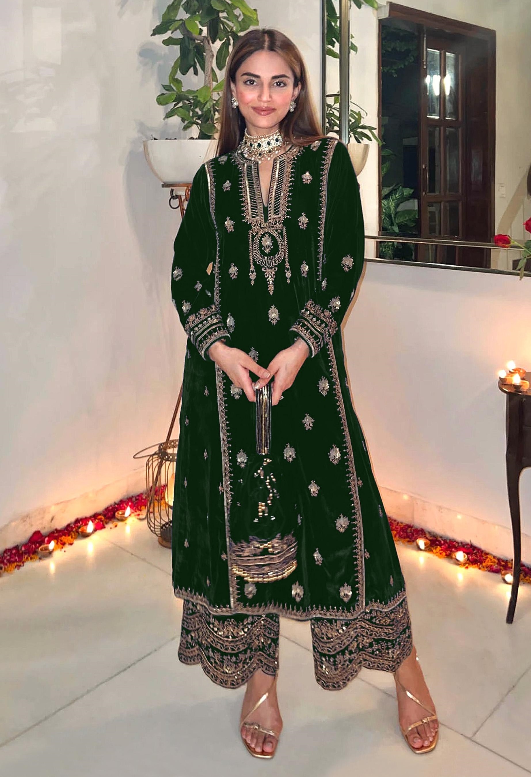 Green Embroidered 9000 Velvet Semi Stitched Salwar Suit