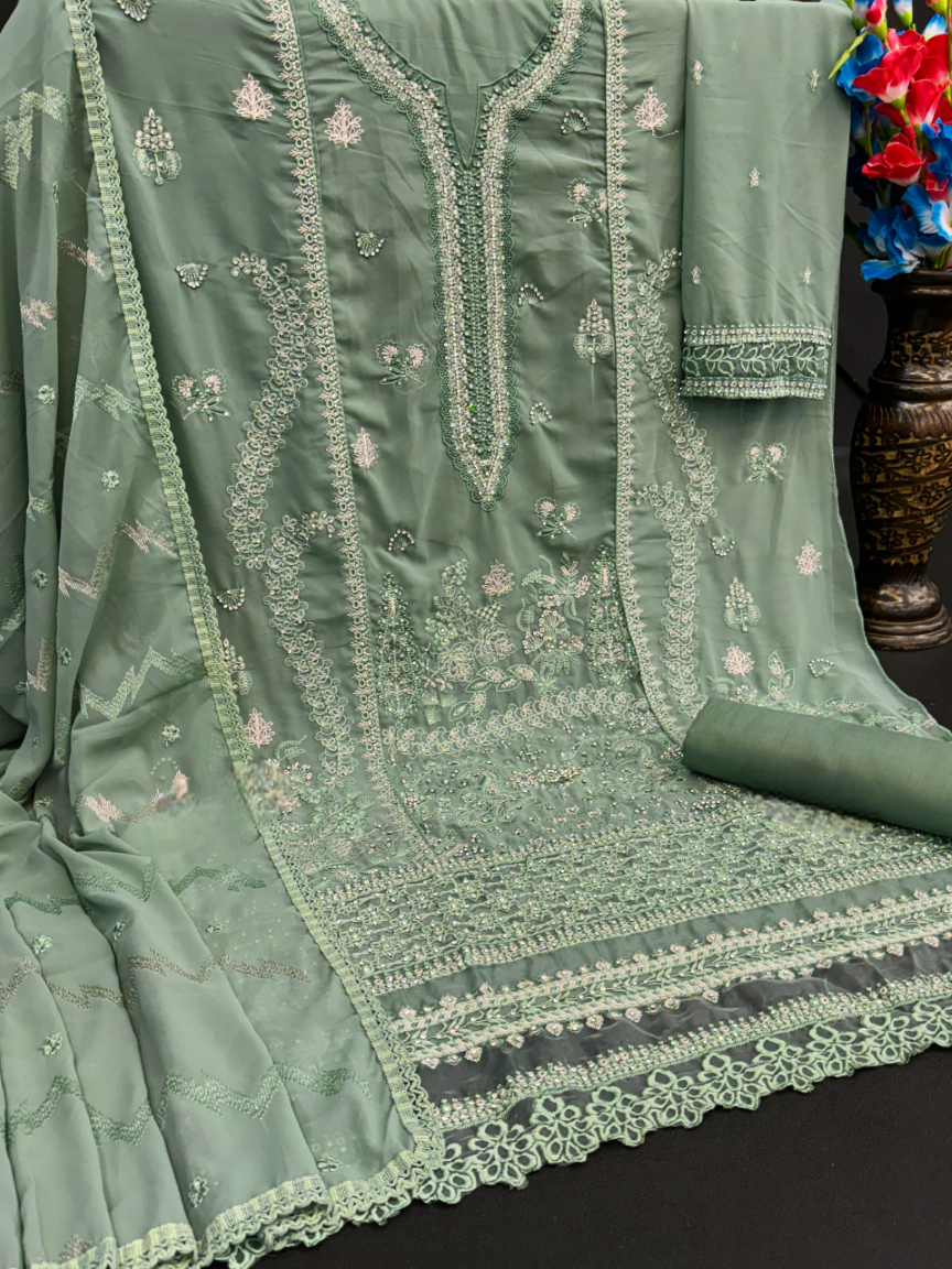 Green Embroidered Faux Georgette Semi Stitched Salwar Suit