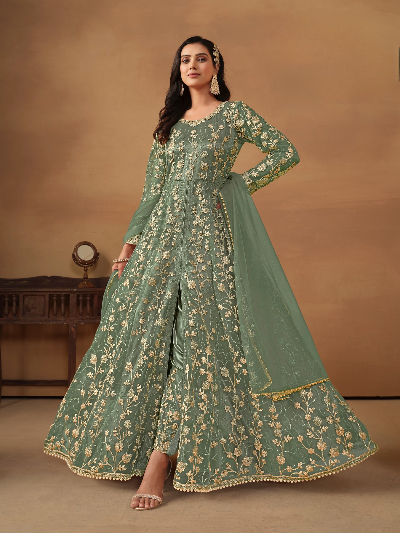 Green Embroidered Net Semi Stitched Anarkali Suit
