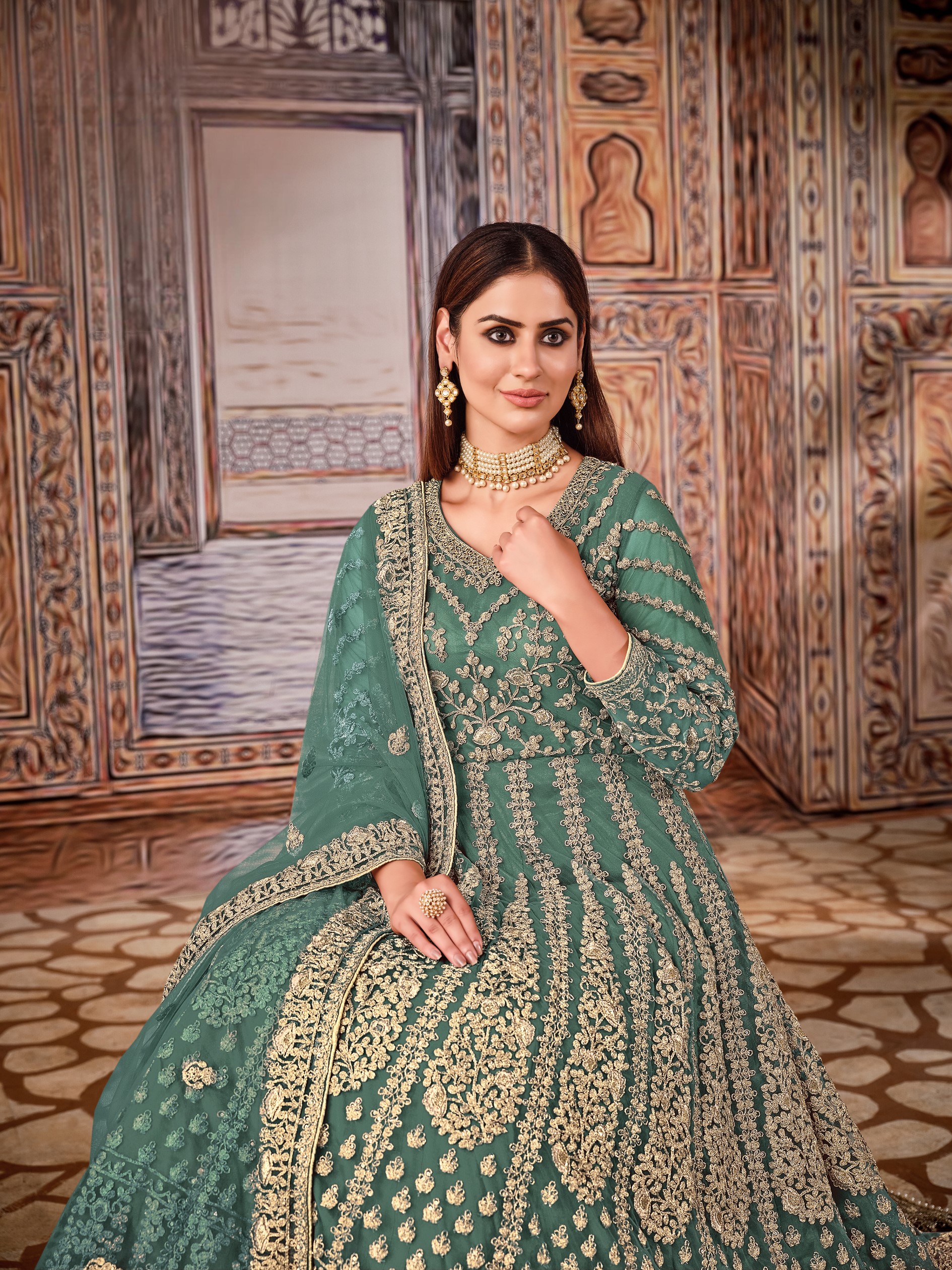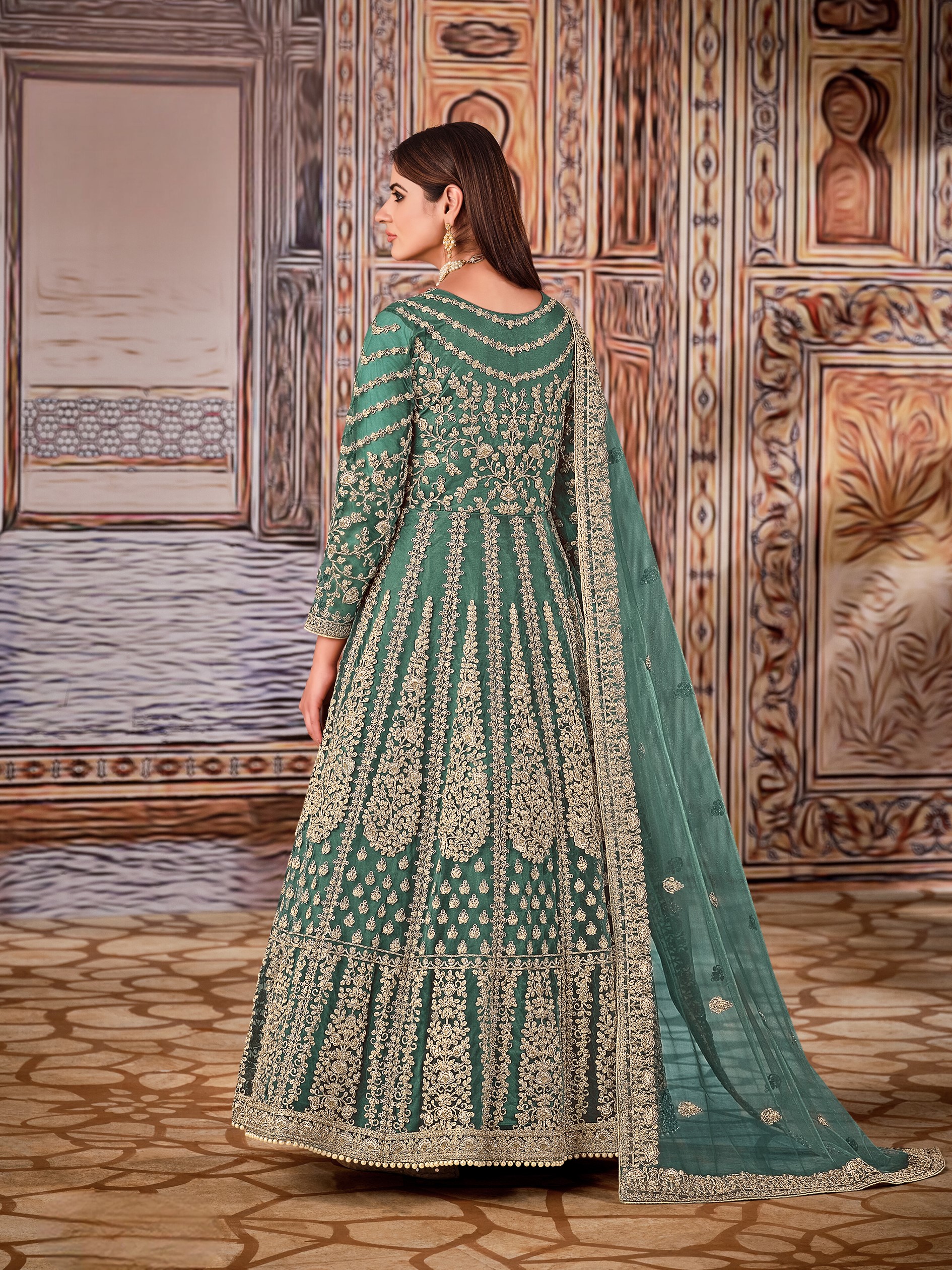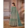Green Embroidered Net Semi Stitched Anarkali Suit
