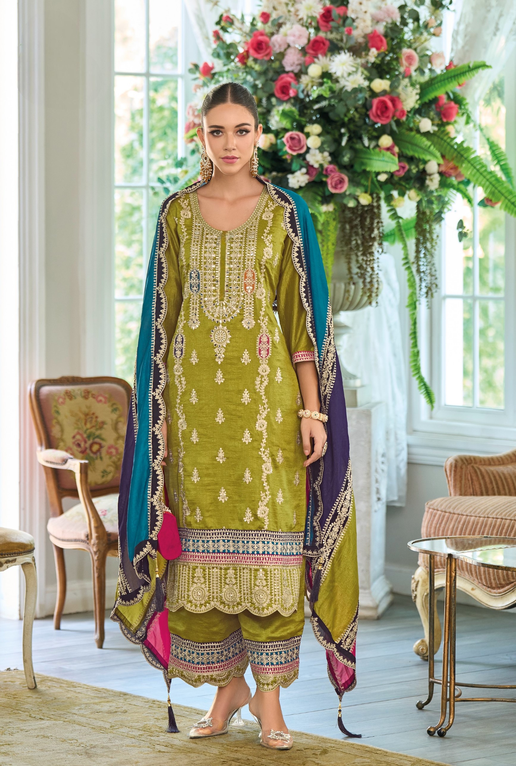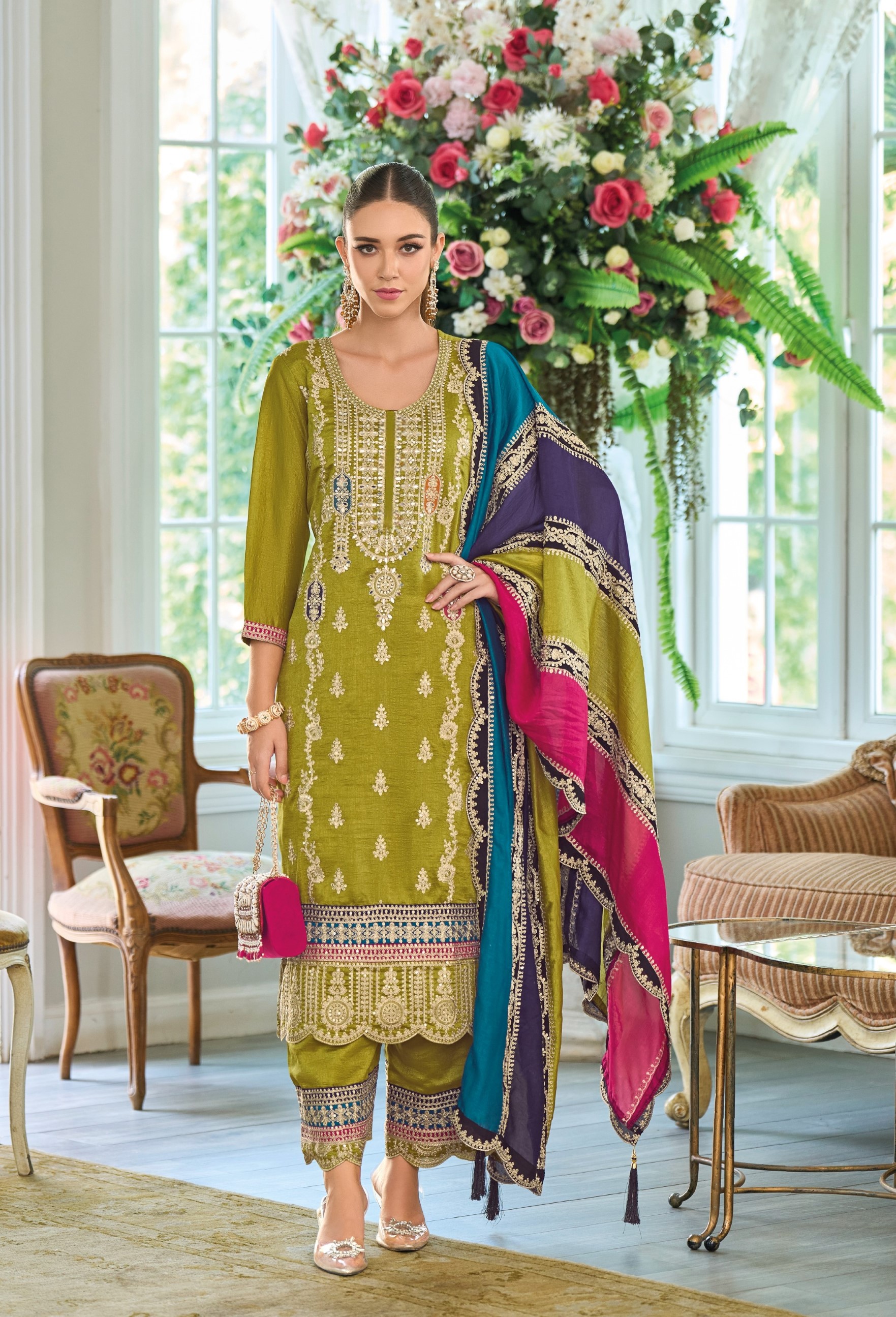 Green Premium Embroidered Chinon Semi Stitched Salwar Suit